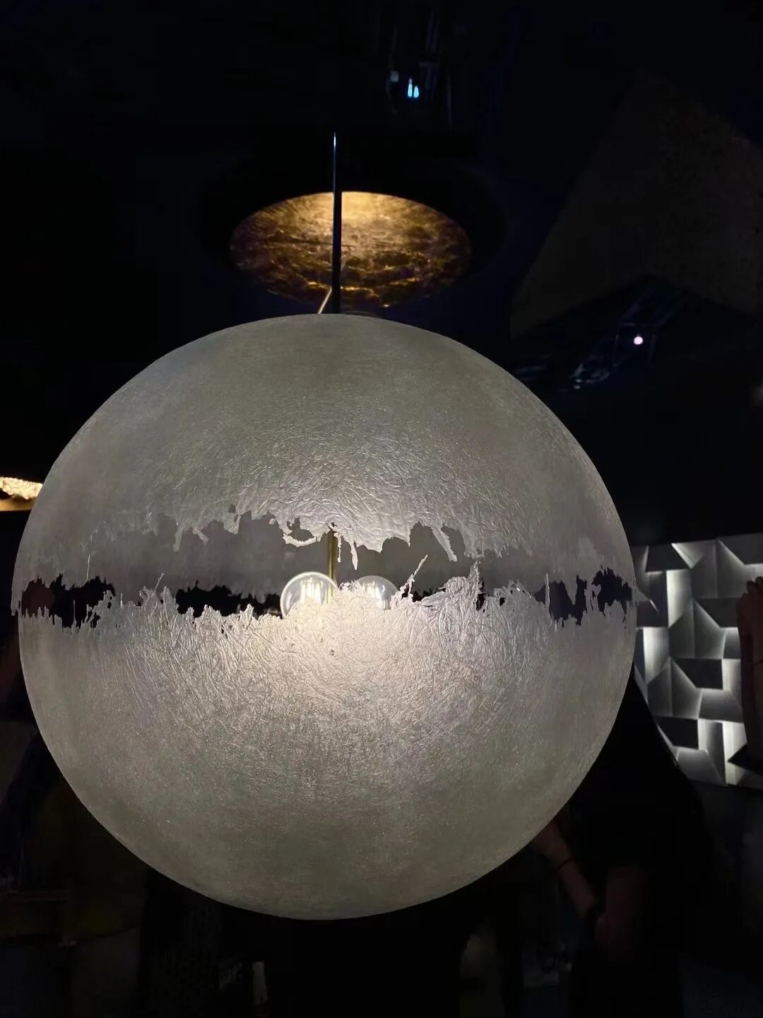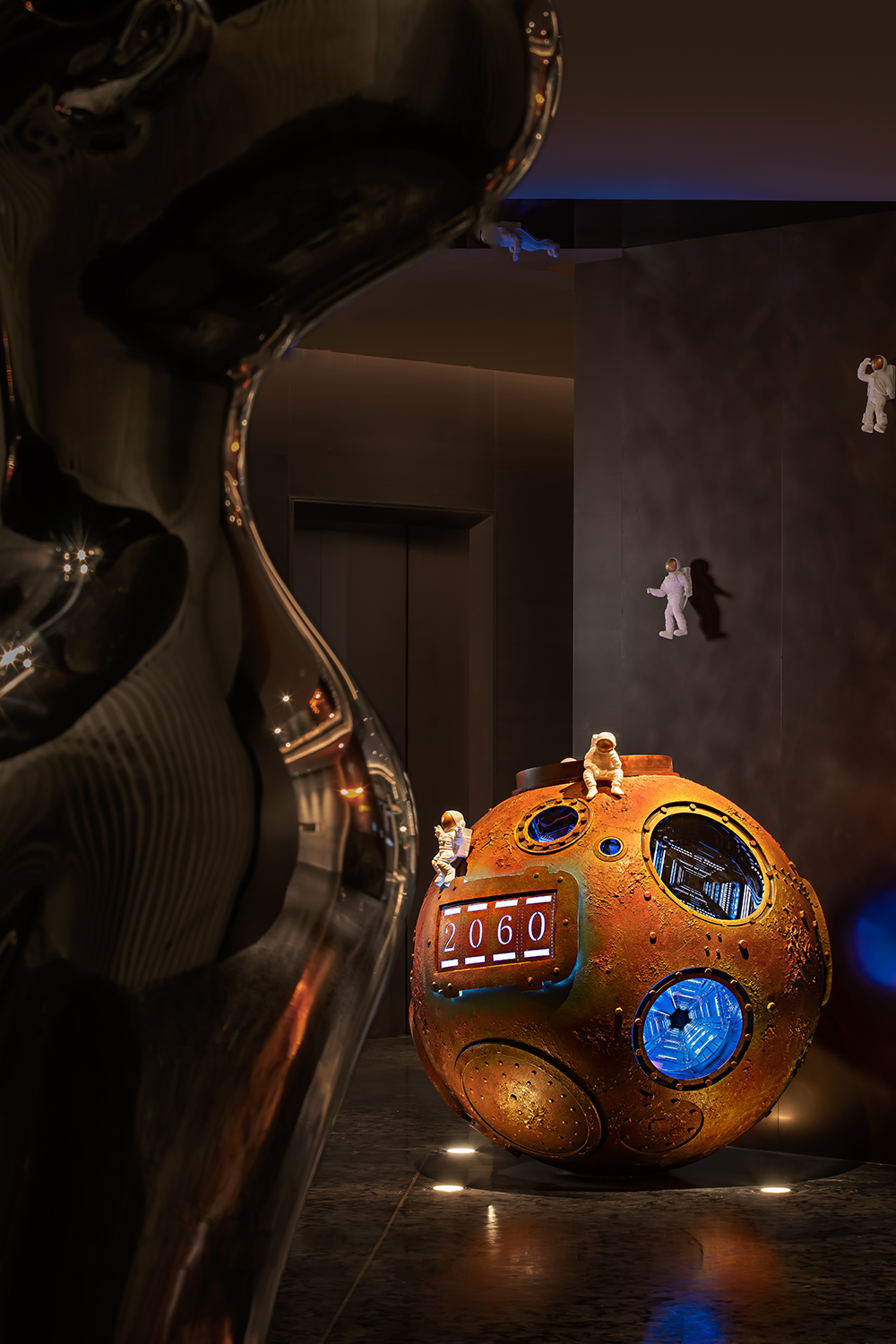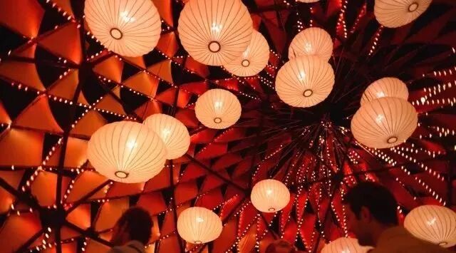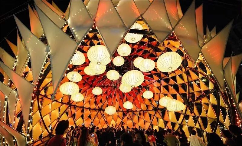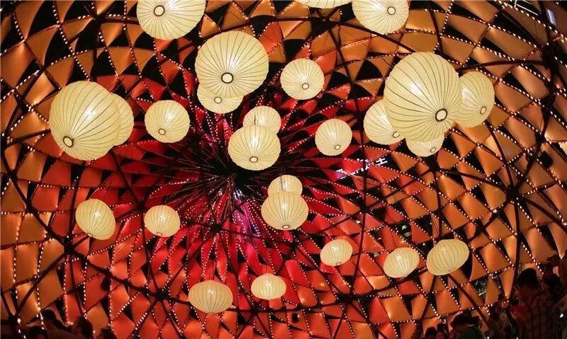 设计灵感源自传统的中式灯笼和“嫦娥奔月”,这盏6层高的球形月亮灯上覆盖着各种色彩和图案的抽象火焰,象征着传说故事中嫦娥与后羿这对重聚的夫妇那一天热情洋溢的爱情在燃烧。