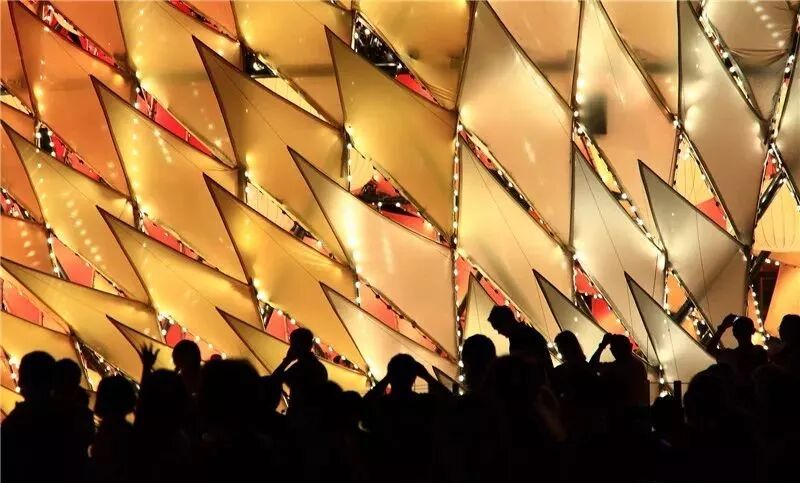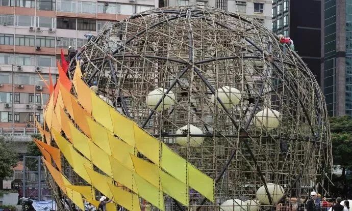 彩灯采用了传统的竹制脚手架技术——一种高速的、本能的方式建造脚手架。这种直观和不精确的工艺与精确的数字设计技术相结合,准确地安装和弯曲竹棒,形成一个网格,包裹着钢穹顶。