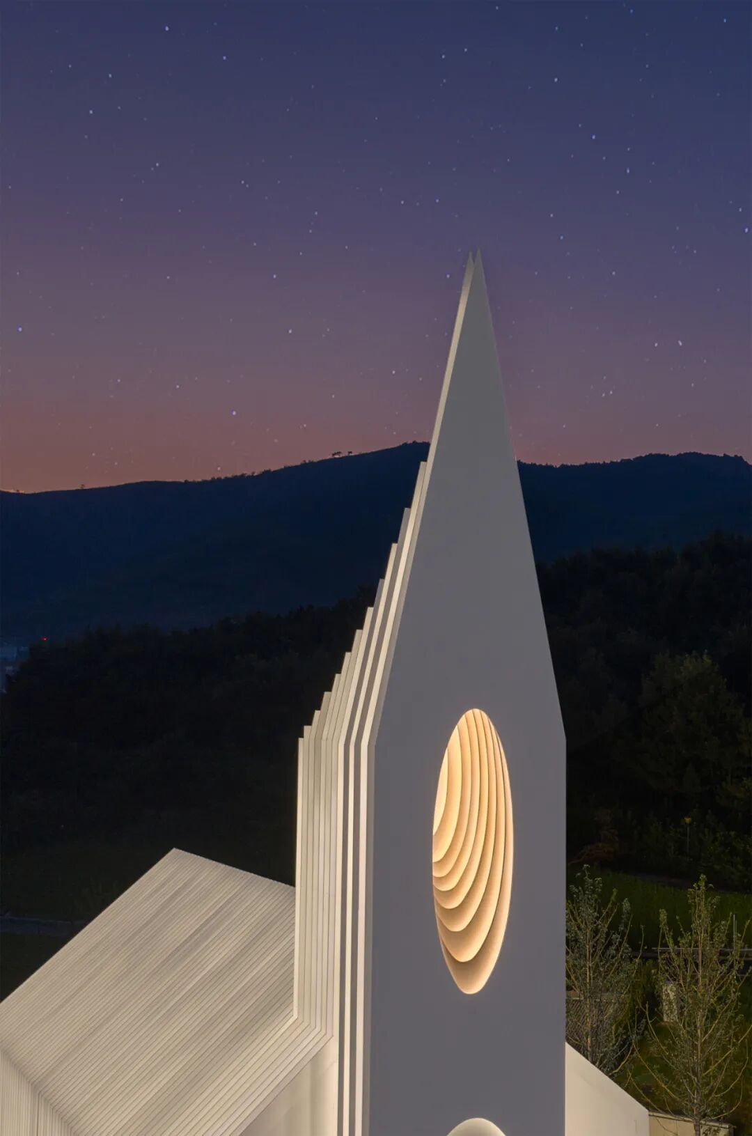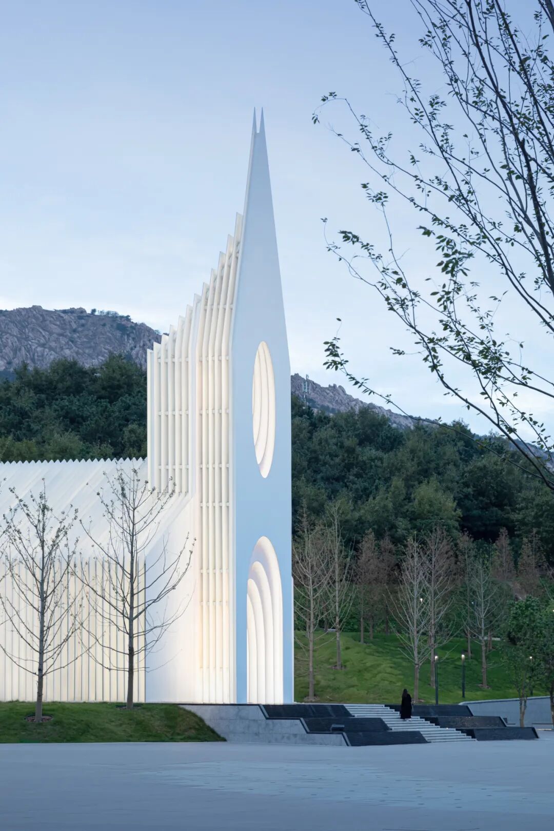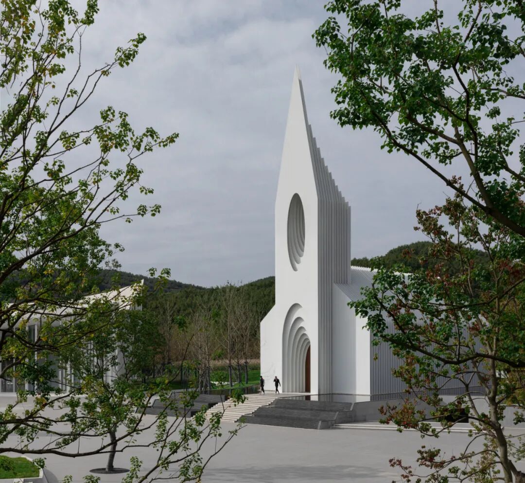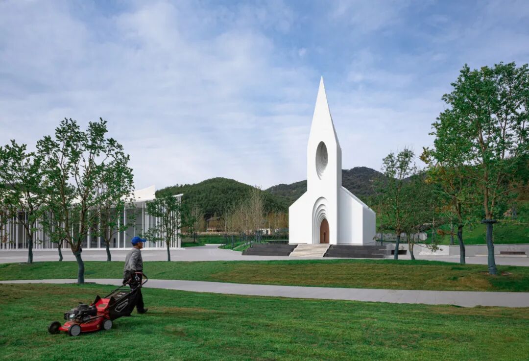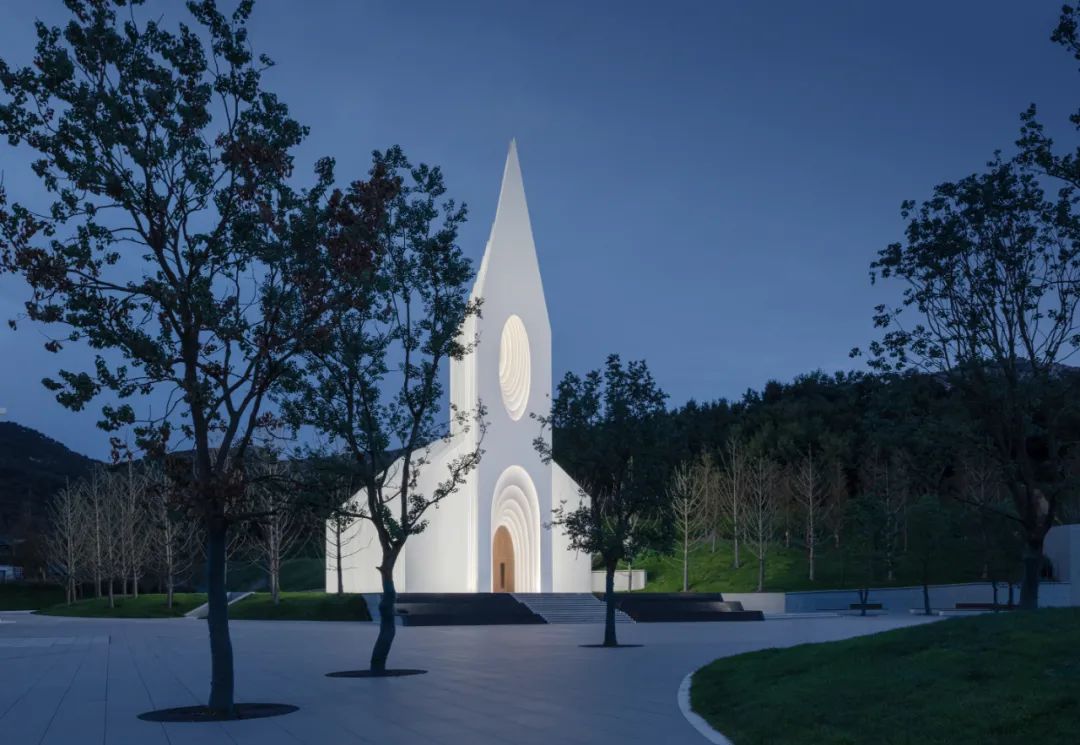 这样的轮廓也从第一重的视觉的体验上符合业主和使用者对这一空间的想象与期待;而连续的每部分切片又以相对纯粹且现代的方式得以呈现,故而使礼堂的外部会根据观察者的角度变化而呈现出不同的效果。