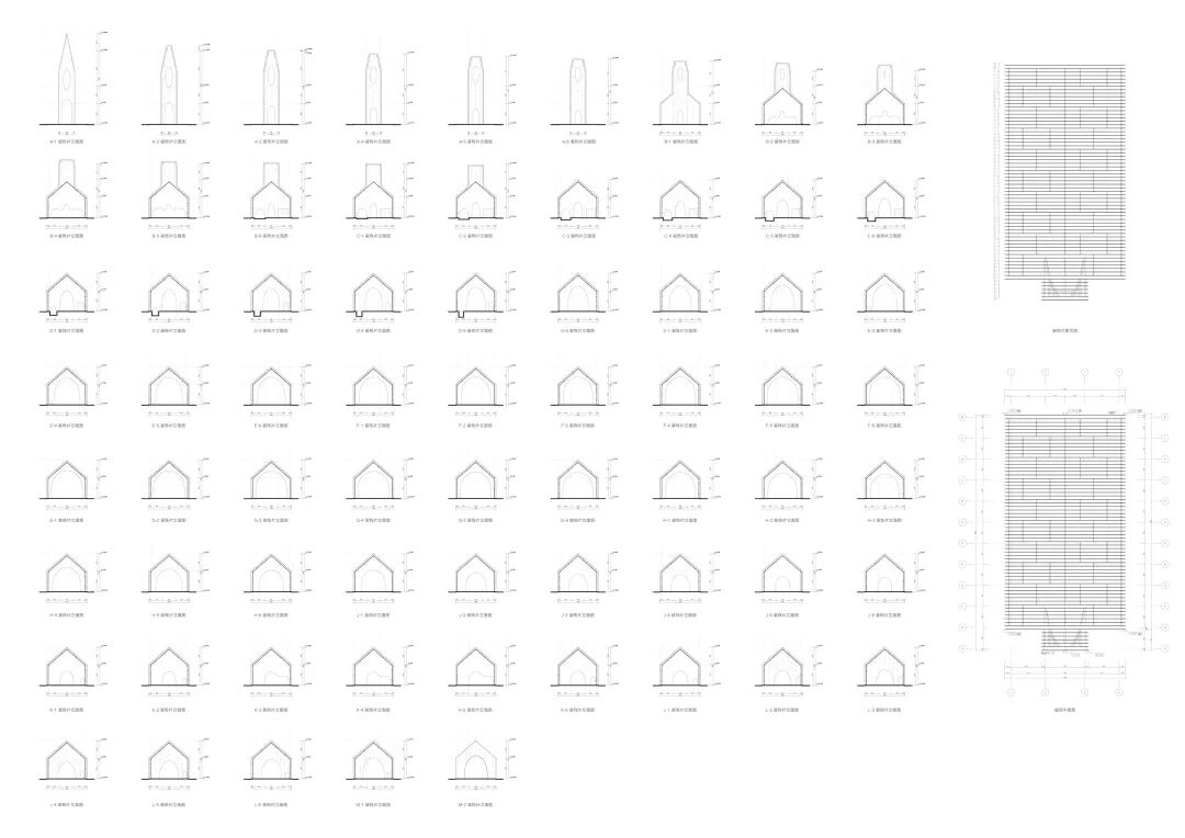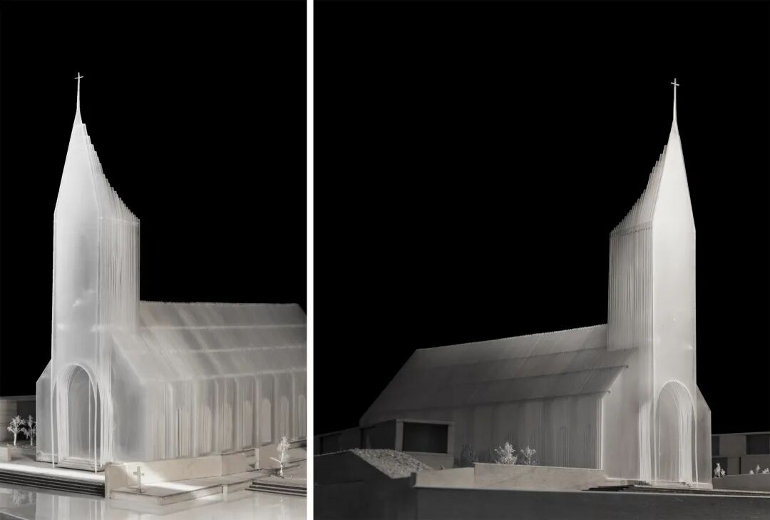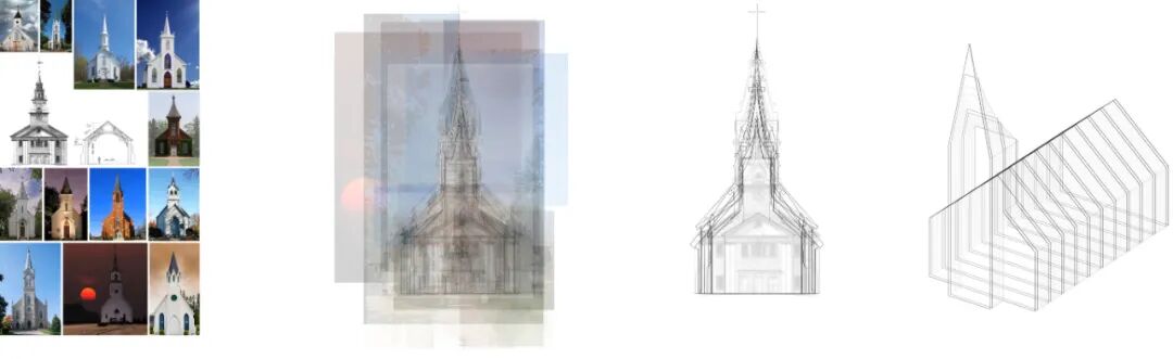 作为建筑的外部形象,我们认为它必须是纯粹的,以使人得以回归小礼拜堂的原型和认知。故而设计过程中,数百个乡野传统教堂的空间及立面形象的抽取,共同勾勒出了一个符合认知意义通感的体量轮廓(切片)系列。