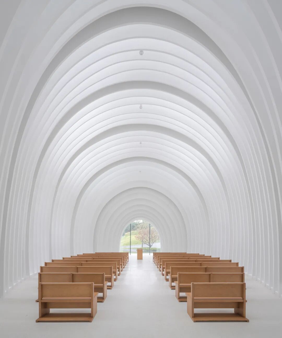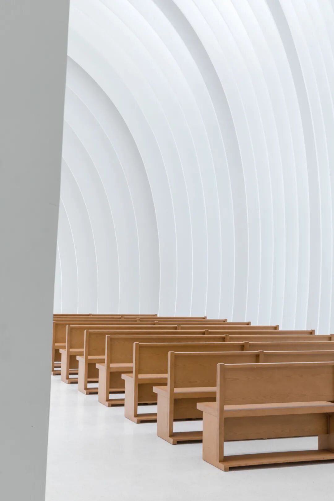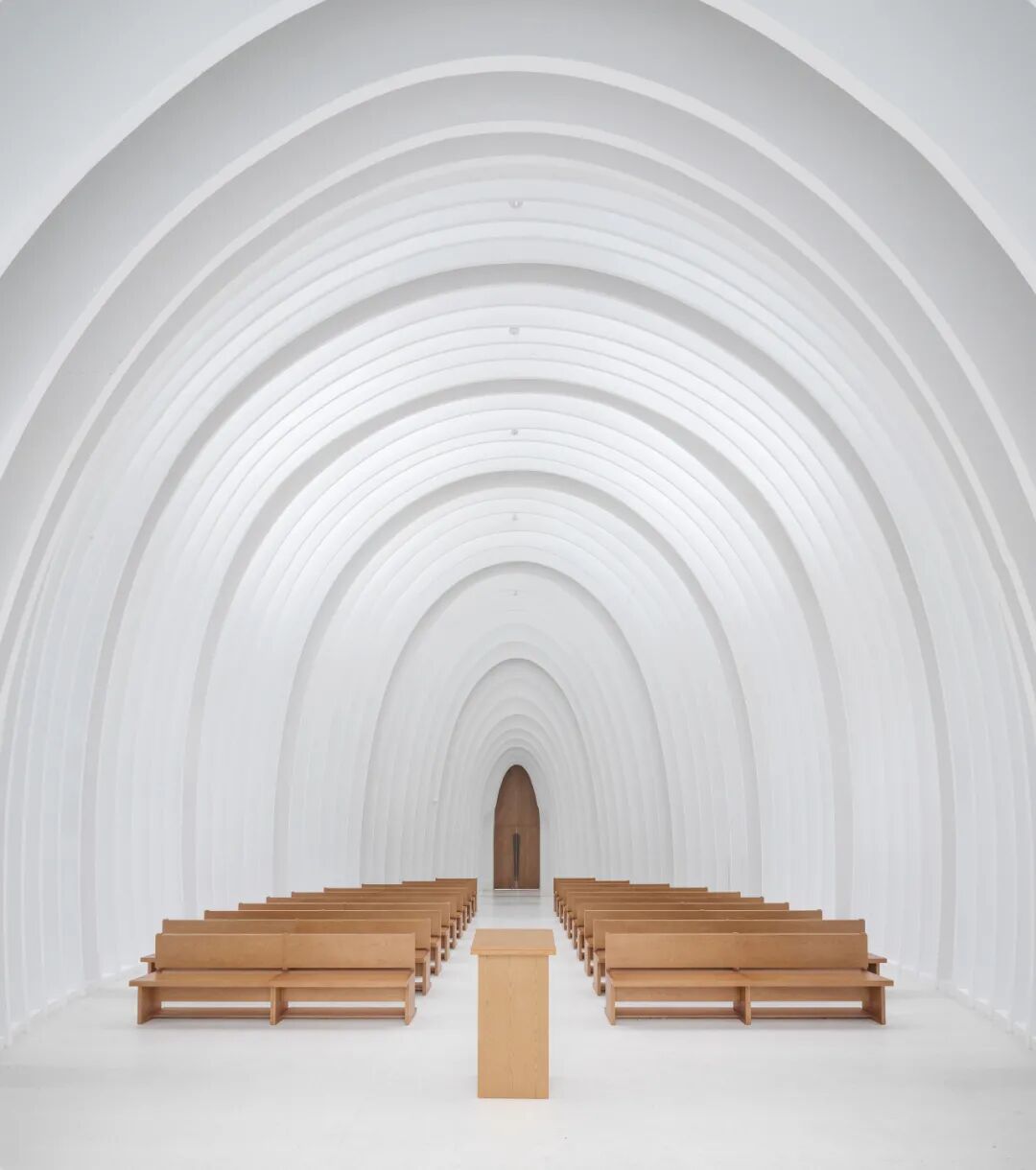 柔和的弧线形的内部空间遵循传统的长方形教堂的平面形式,用一种更加现代的解读方式,创造一系列弧顶架使得内部空间具有更佳流动的体验感。
