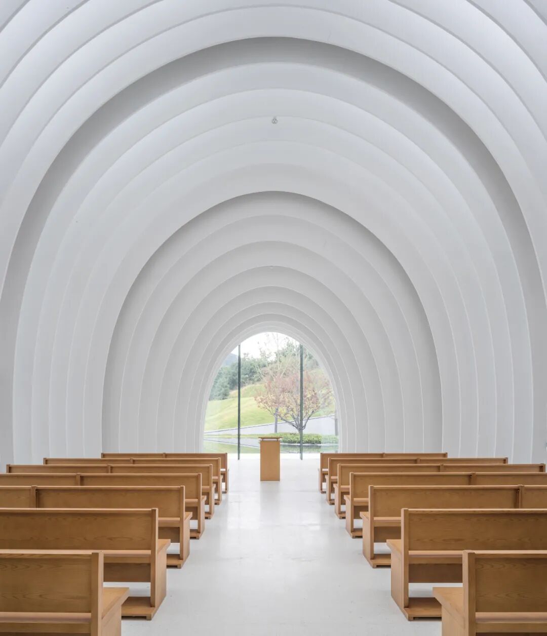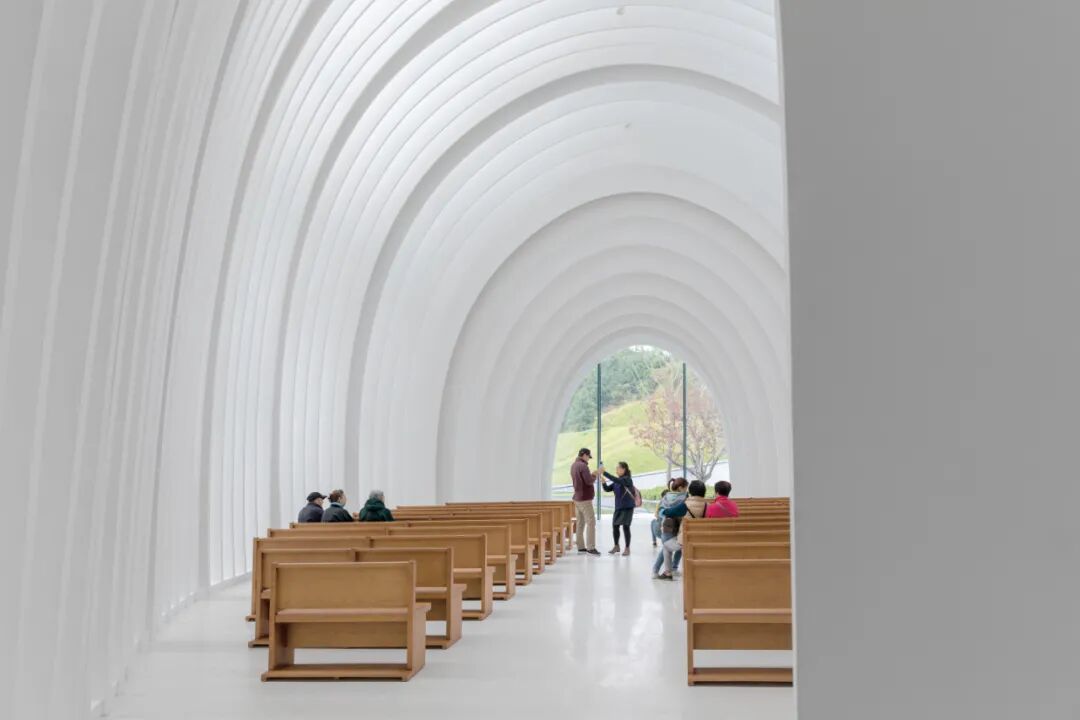 层叠的白色切片在柔化室内光线的同时,也包裹了建筑的主体框架和构造系统,使整个月空礼堂呈现出一种简明而抽象的氛围,它既是属于当代的审美倾向,又是对传统教堂形态的呼应,是传统与当代一种融合。