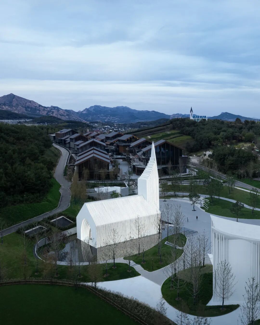 总平面倾向于一种更加内向的氛围,利用一系列景观对视线的遮挡和背侧湖水的平静,打造一个教堂入口前的“舞台“去强调其核心的位置。