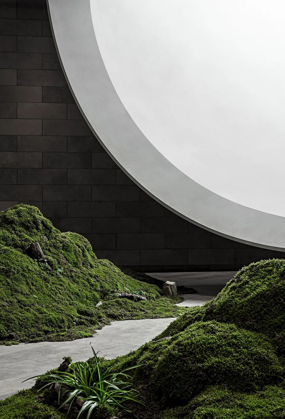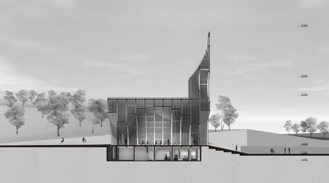 月空礼堂在纵剖面上的黑白分明的部分增加了灰度与横剖面关系上光影介入的可能,且以一种连续的切片方式将传统的腔体关系进一步异化。