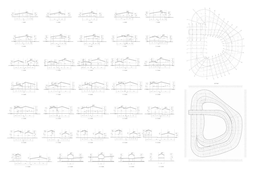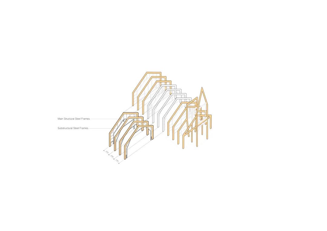 2. 门式钢架由11组主框架,和每组主框架之间的10x6组副框架共同构成。主框架定义了婚礼堂的横向外轮廓,副框架则在龙骨的协助下定义了婚礼堂内部的“洞穴”空间轮廓。两重轮廓也形成了建筑外刚内柔的基本关系。