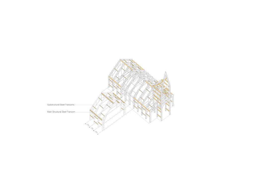 3. 系列门式钢架之间的联系同样由两种级别的结构杆件实现:主梁贯穿并拉结所有钢架,同时明确地勾勒出婚礼堂的纵向外轮廓。副梁与主梁不同,其在设计中被有意错动了。一方面是在没有增加杆件的情况下,减少了杆件之间的间距,使得整个建筑形成了一个类箱体的结构。结构的表达在纵向上被异化与消解,而横向门架在纵向上形成的空间递进感得以加强。另一方面,副梁同时成为了外立面构造的龙骨,实现了表皮与结构的融合。