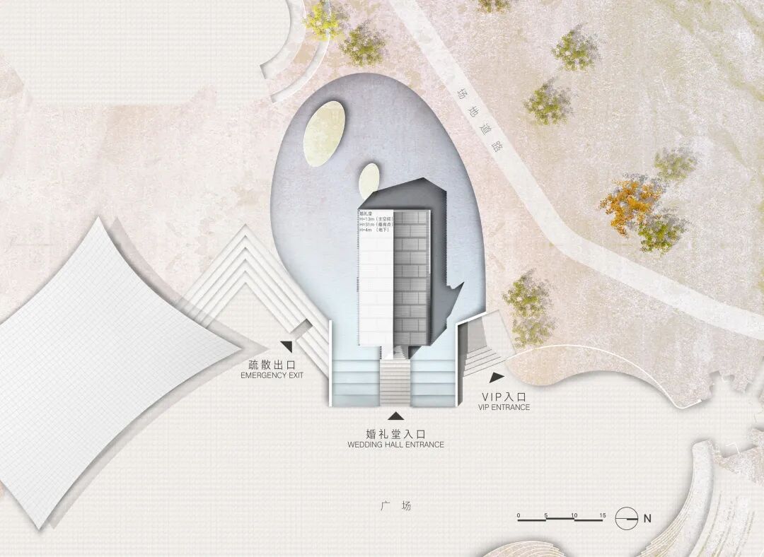 为了强调建筑的传统根源,顺延传统布局方式,礼堂主体的朝向直接设置在正东西。并作为精神性建筑置于整个场地建筑群体的中间部位,高差的变化沿着建筑的前侧边缘流过,将场地自然的划分成东侧的广场与西侧环绕建筑的坡地景观与人工湖。