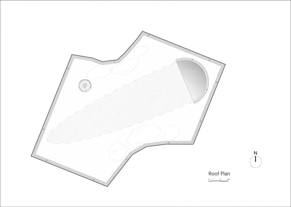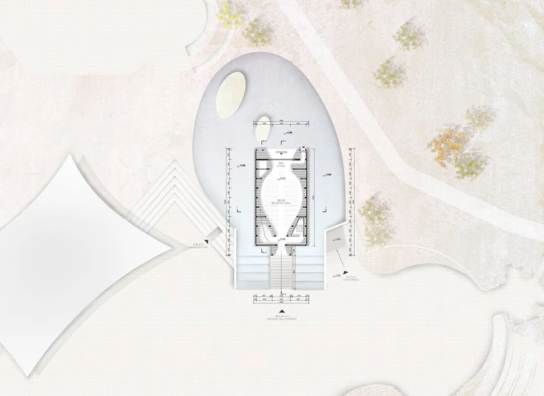 背侧景观试图打破建筑层面的硬质边界感与轴向关系,偏心的湖体轮廓,与置于其中的岛洲,亦和礼堂室内的轴线形成了偏心的对景画面。