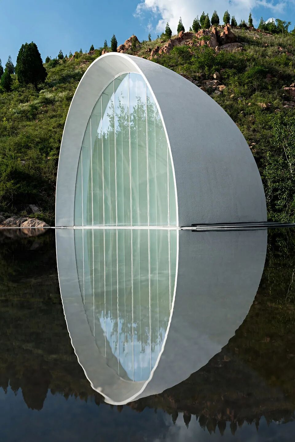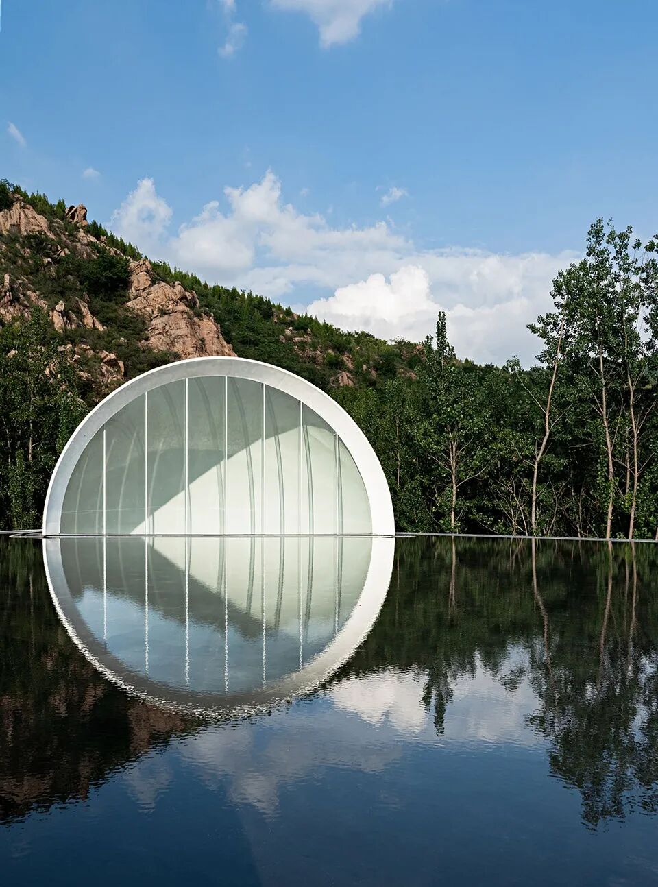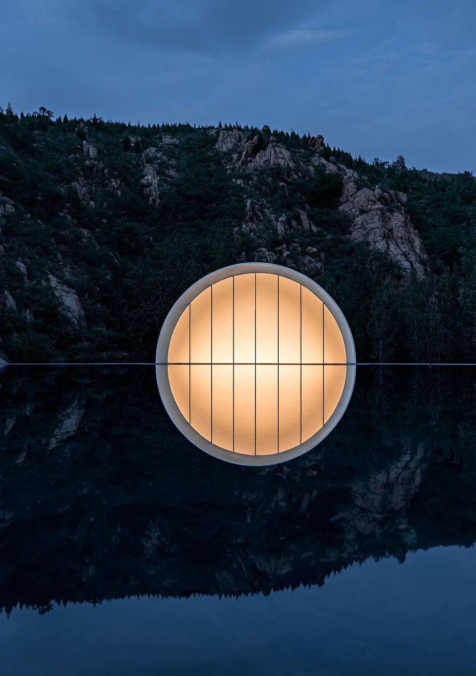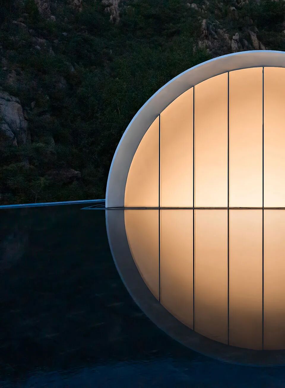 “故乡的月”仪式堂将一轮满月对半分开,又借助水面和不锈钢水波纹板用“倒影”予之圆满。或许人生的本质正是缺憾,而我们寻觅的“另一半”是寻觅一种“圆满”:他/她是注定能完善“我”的人,是修补“我”人生缺憾的“另半边月亮”。建筑上为阳、下为阴,阴阳相合、有无相生,与“仪式堂”的功能可谓天作之合。