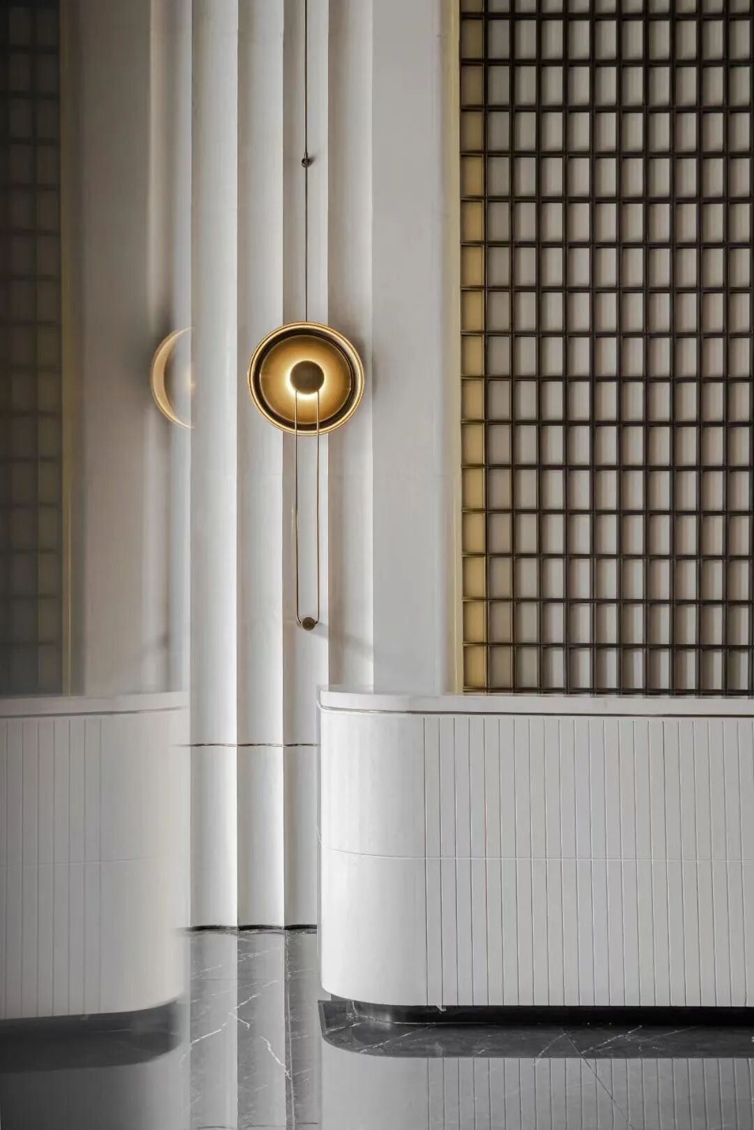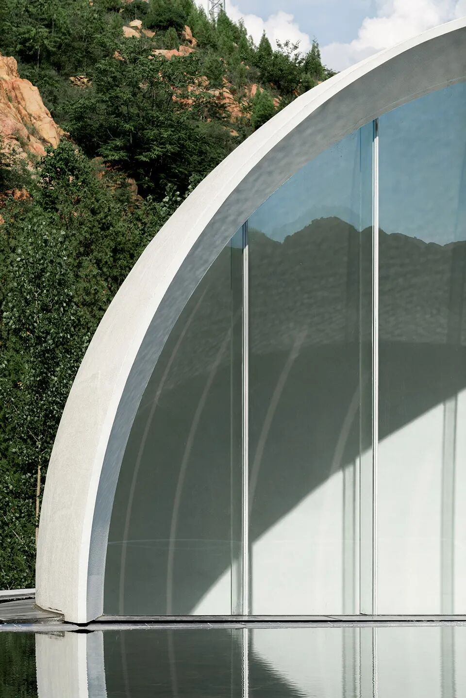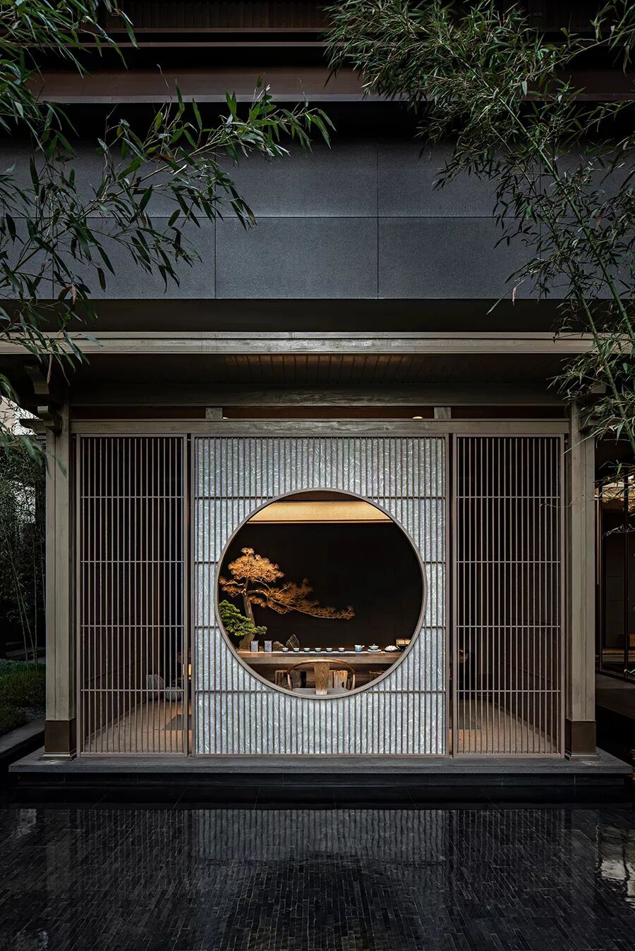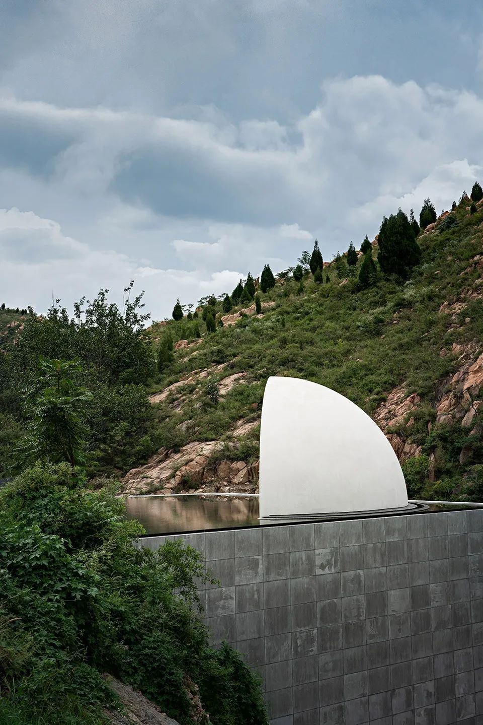 “故乡的月”仪式堂将一轮满月对半分开,又借助水面和不锈钢水波纹板用“倒影”予之圆满。或许人生的本质正是缺憾,而我们寻觅的“另一半”是寻觅一种“圆满”:他/她是注定能完善“我”的人,是修补“我”人生缺憾的“另半边月亮”。建筑上为阳、下为阴,阴阳相合、有无相生,与“仪式堂”的功能可谓天作之合。