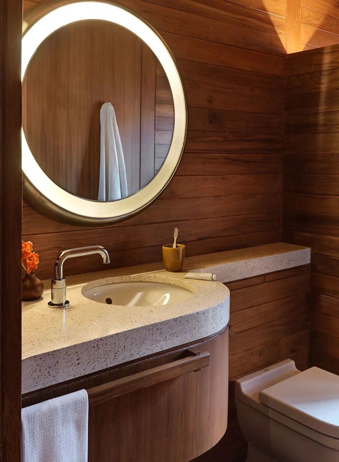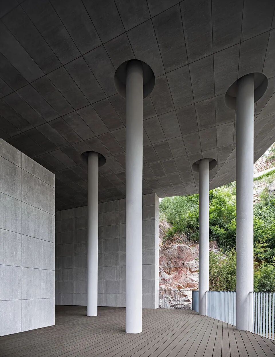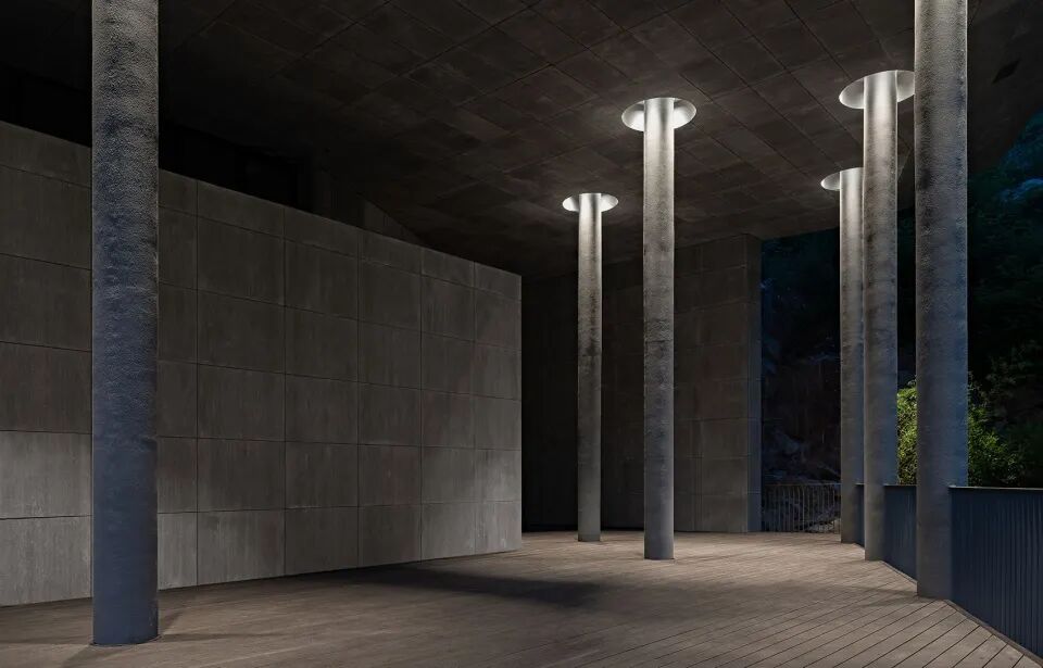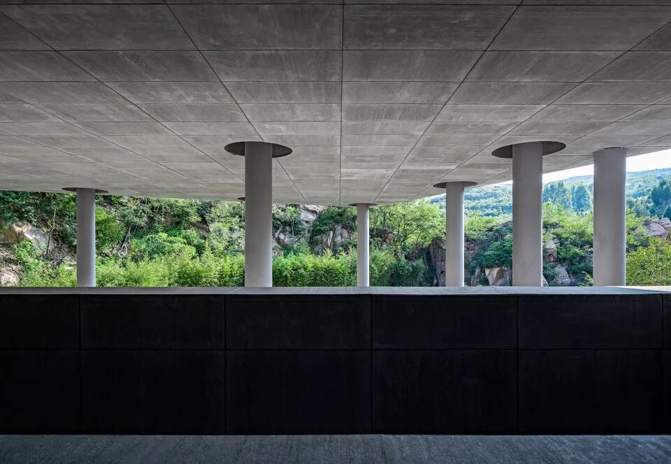 袈蓝建筑将“爱”的唯一性诠释于空间,接近山体原色的美岩板、石材、清水混凝土包裹着建筑的内外墙面与地面,与山体融为一体。而在屋顶,高透超白玻璃的运用确保日光自在地穿过孔隙,照亮室内。