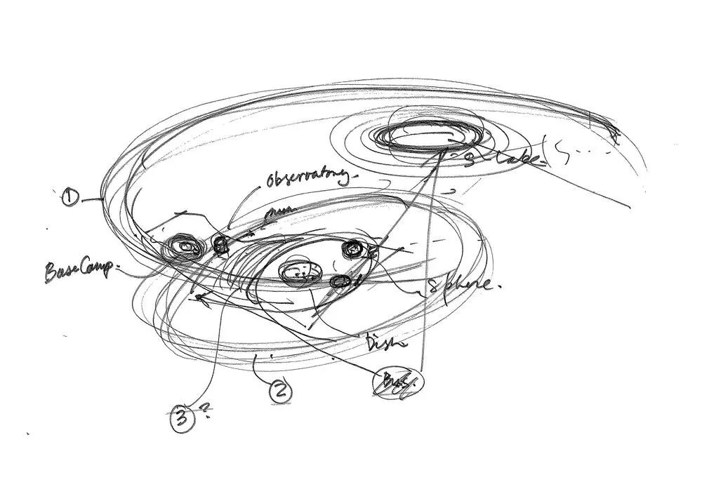 在设计过程中,设计团队希望打造一个可以将天文馆的功能和建筑实体完全融合的存在,让建筑本身兼具教学意义,因此天文馆的建筑外形借鉴了部分宇宙运行的基本原理。设计团队摒弃了直线或直角,真实地反映宇宙的几何形态和天体运动的动态能量。Thomas J.Wong从物理学经典的“三体问题”中汲取灵感,在设计上着眼于太阳系内天体之间由引力所产生的错综复杂的运动轨迹,并将这一理念在天文馆弯曲的外观、狭长的带状建筑上展现得淋漓尽致。