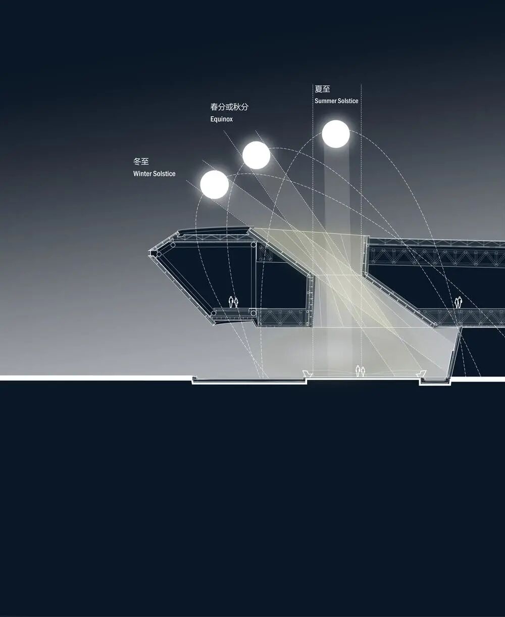 圆洞天窗位于天文馆主入口处,阳光穿过圆洞时会在地面形成光斑,且随着太阳在天空中的移动,光斑也会随之移动到地面的入口广场和反射池,以记录时间的流逝。当光斑与地面圆形标志完美重合的时候,就宣告着夏至日正午时分的到来。整个圆洞天窗好似一个日晷,无时无刻不在捕捉光影,记录时间。