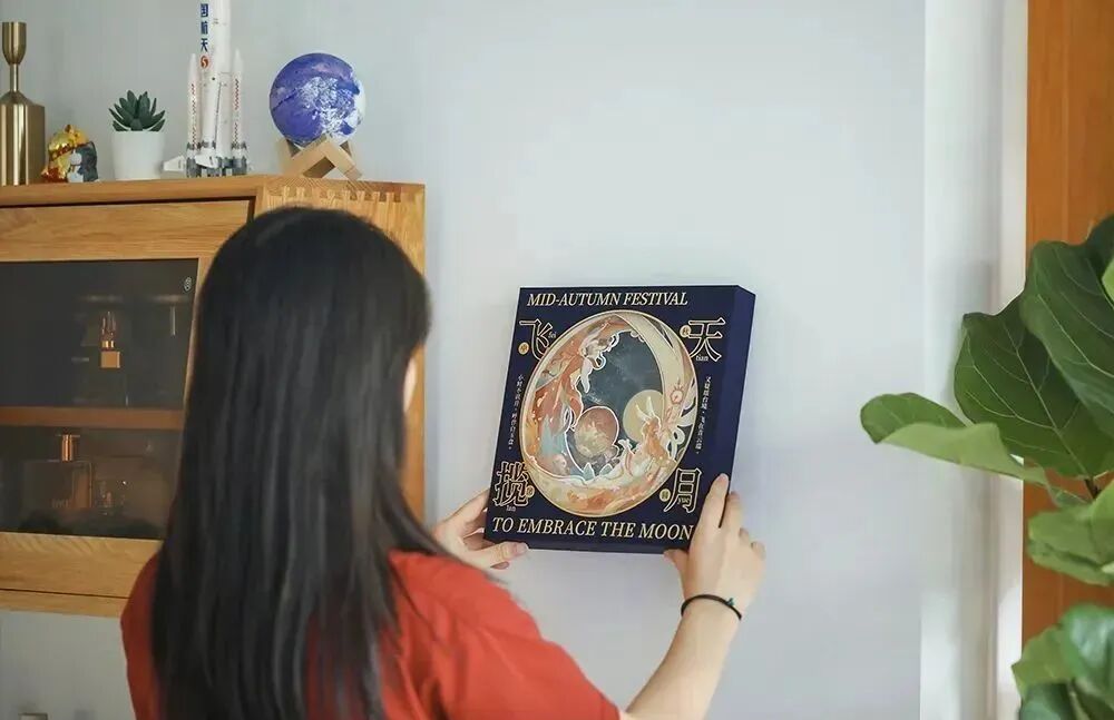 礼盒侧边还设置巧妙按钮扣开关,底部设有挂钩,吃完月饼的礼盒还能作为装饰画挂在墙上。