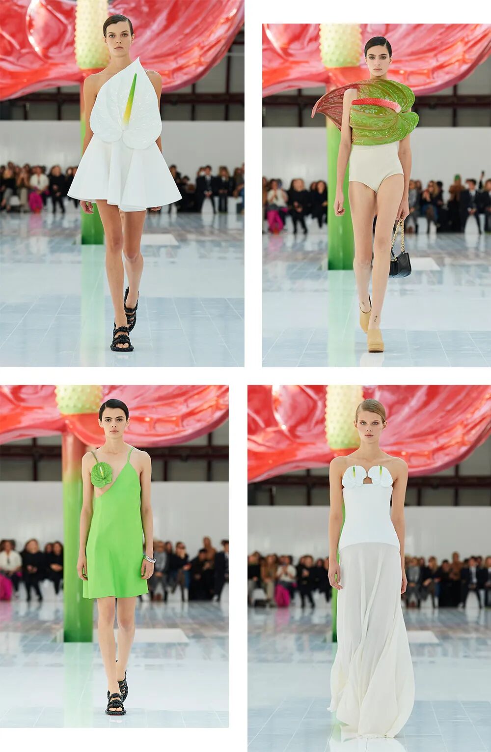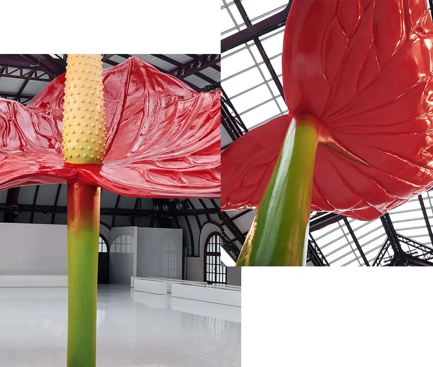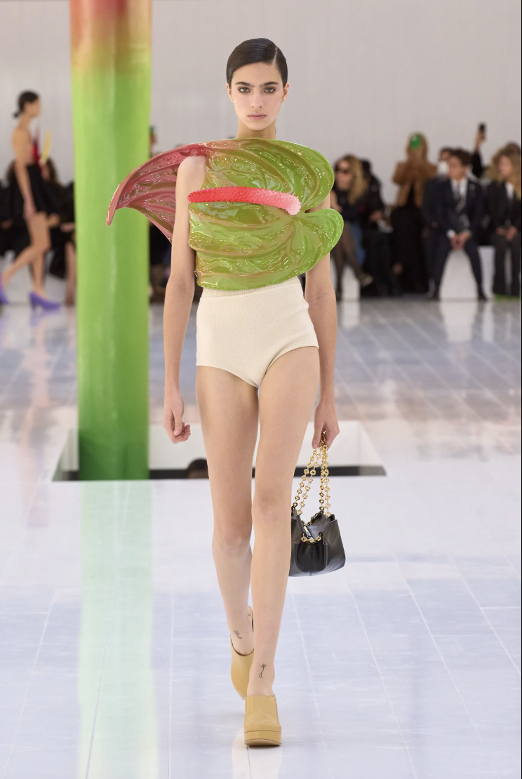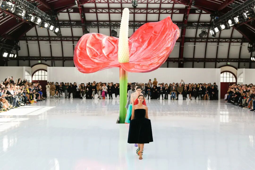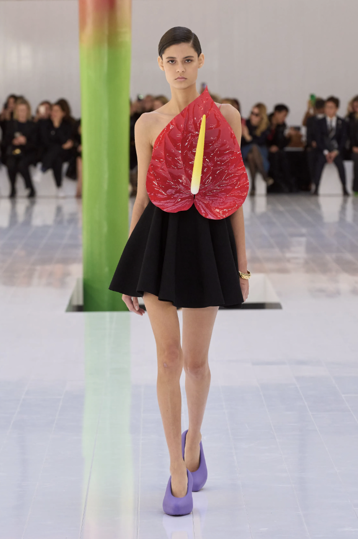 一株超乎寻常的红掌婀娜多姿地扎根于秀场空间中心仿佛是Jonathan Anderson无意中从花园里采摘的红掌,想象力由此迸发,无限延长。