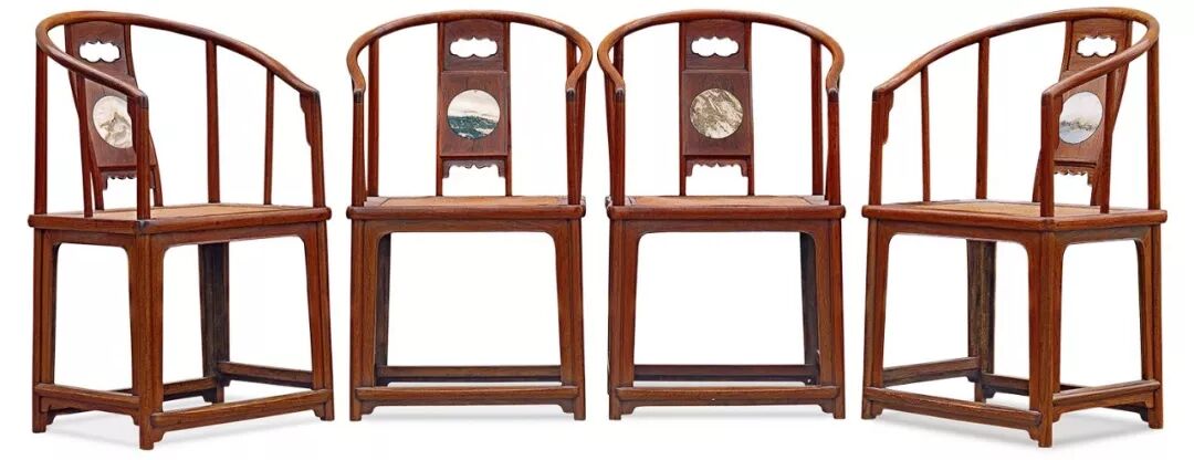 此圈椅造型简洁明朗,身形挺拔,靠背板由三段攒成,中段圆开光內镶嵌精心挑选的圆形大理石,以表現四季不同的风光。