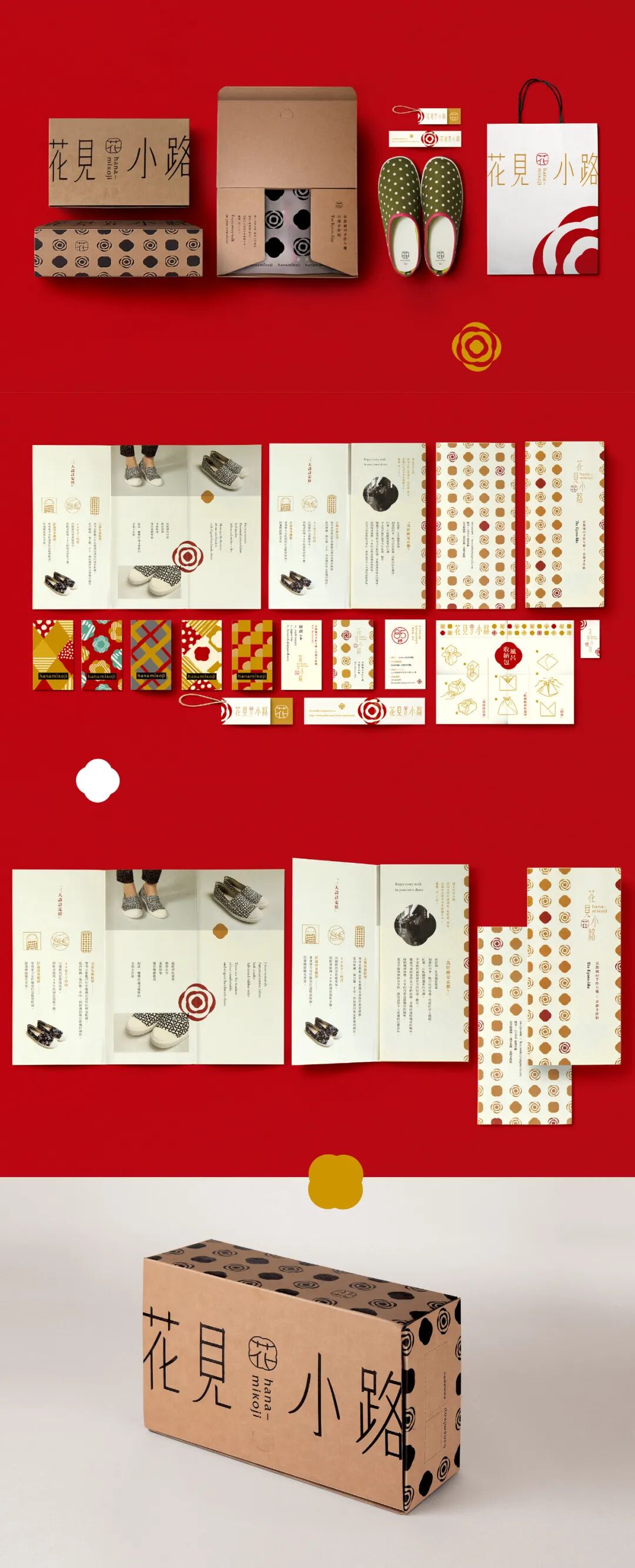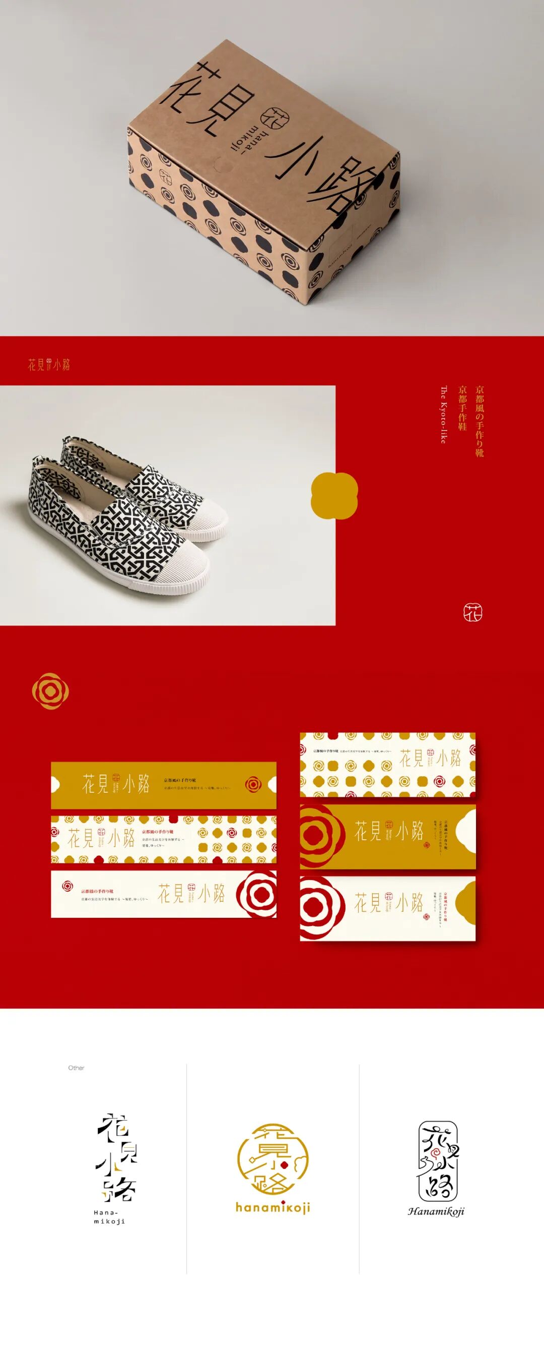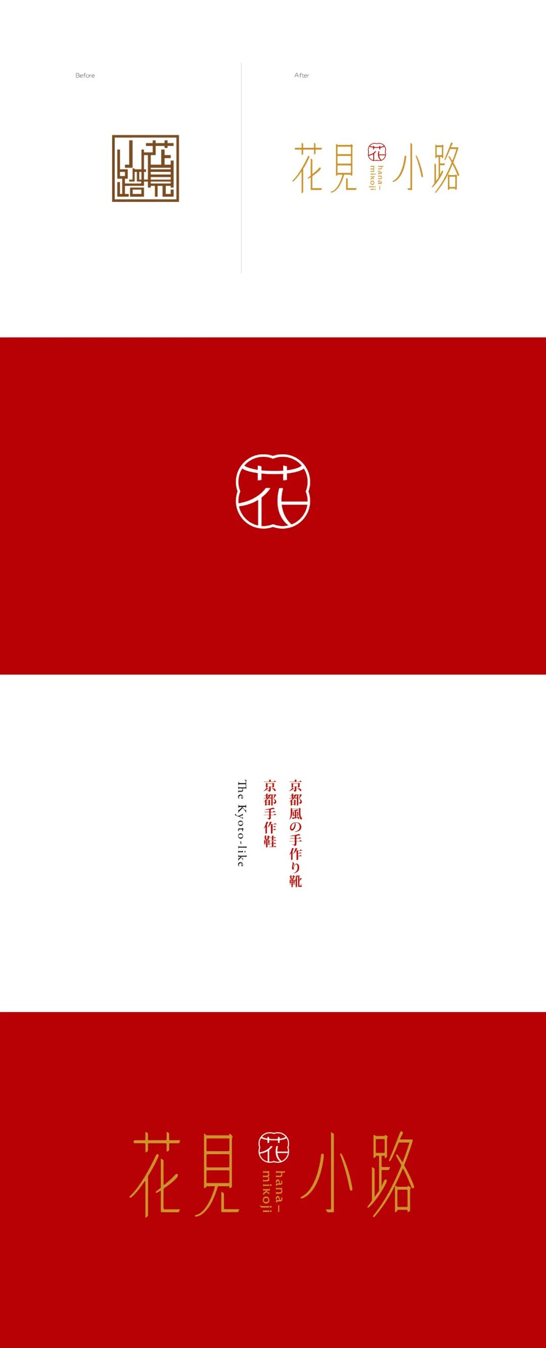 以日本京都地名「花见小路」字样为整体形象识别,仿古日式「木花格」样貌来象征品牌,融合京都精致优雅与台南精湛技术的意涵,也彰显出共同浓厚的文化底蕴与人情之味。设计师为加强手工鞋舒适柔软的印象,决定在识别「花」上加入柔棉框边的巧思,让整体的品牌识别充满亲切圆融与产品的舒适。 「花见小路」标准字设计上,有着日本艺妓在京都石板路上的优雅体态,并在「路」的字型设计出「路」的意象,不但有慢活步调的文化内涵,也予品牌经营「路」上不断的向前进,代表花见小路生生不息永续发展的企图心。这样的形象落实于整体平面与包装设计上,也成功的使品牌快速打入了台湾知名文化创意事业和台南在地文创百货:「诚品生活」与「林百货」。