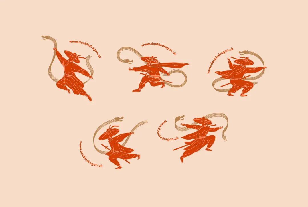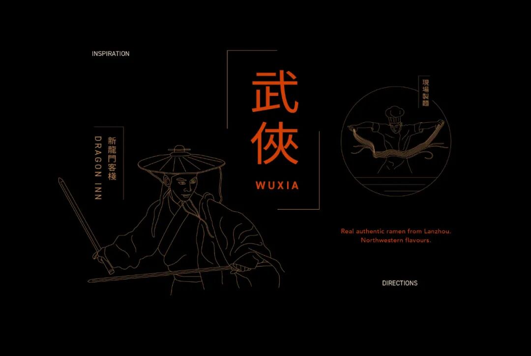 设计灵感来至中国武侠、龙及古建筑屋脊印象。整体品牌形象以武侠、龙及屋脊等中式元素,营造出正宗兰州拉面面食特色,运用“武侠”与“龙”相互过招的趣味性,巧妙结合师傅现场制面的功夫技法,并将中式古建筑“屋脊”造型巧妙结合“吃面”意象,增加品牌故事及形象特色。