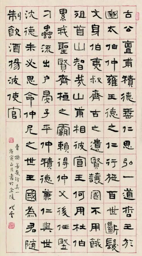 孙晓云老师笔下的隶书,秉承传统,有根基,有古韵,有创新,深入古法,写出了古香古韵,而且还融入自我创新元素。用笔上一丝不苟,精益求精,笔笔入法,字字精准,十分有规矩感,点画安排紧凑,而且相互之间联系十分紧密,处理得也十分和谐稳定,给人一种踏实稳重的感觉,这也是很少见到的气象,线条纤细,但力感却十足,具有金石之气,字的大小、疏密,墨法的干湿、都恰到好处,可见,她的隶书功底也十分了得的。