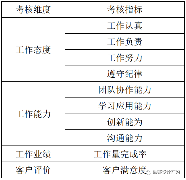 在考核指标方面,中小型设计院要结合自身的实际情况,并邀请各个岗位的资深员工、部门经理、人力资源经理等相关人员参加,听取专家意见,以此制定月度绩效考核指标和年度绩效考核指标。其中月度绩效考核指标主要用来解决日常工作中出现的诸如进度、质量等问题,而年度绩效考核指标是对人才的全面考核,需要从工作态度、工作能力、工作业绩和客户评价等多个维度进行。