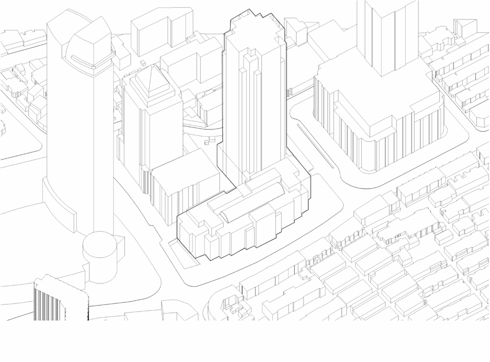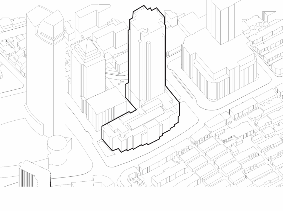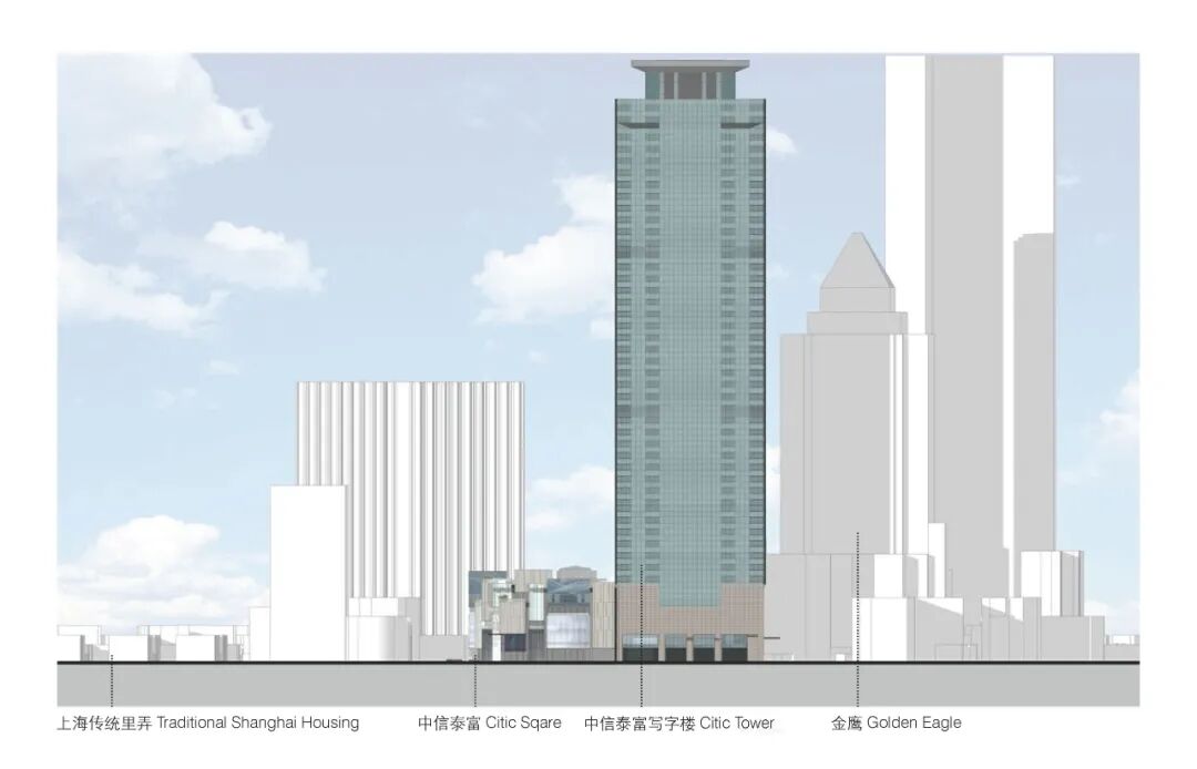 “像素”不仅具有当代内涵,也将该商业空间与其周边悠久的城市历史环境联系起来:中信泰富广场的正对面就是这里保存最完好的弄堂之一,弄堂是由传统巷道房屋的围起来的建筑群,通常有两到三层楼高,可追溯至20世纪初,代表着典型的老上海风貌。像素立面消解了整个体块,使其与对面的旧建筑在规模上保持一致性;而全透明或半透明的玻璃幕墙与UHPC混凝土板则让新旧之间产生了对话。
