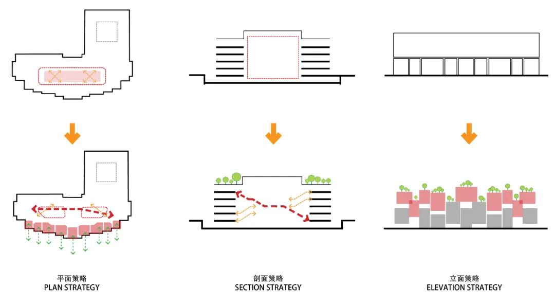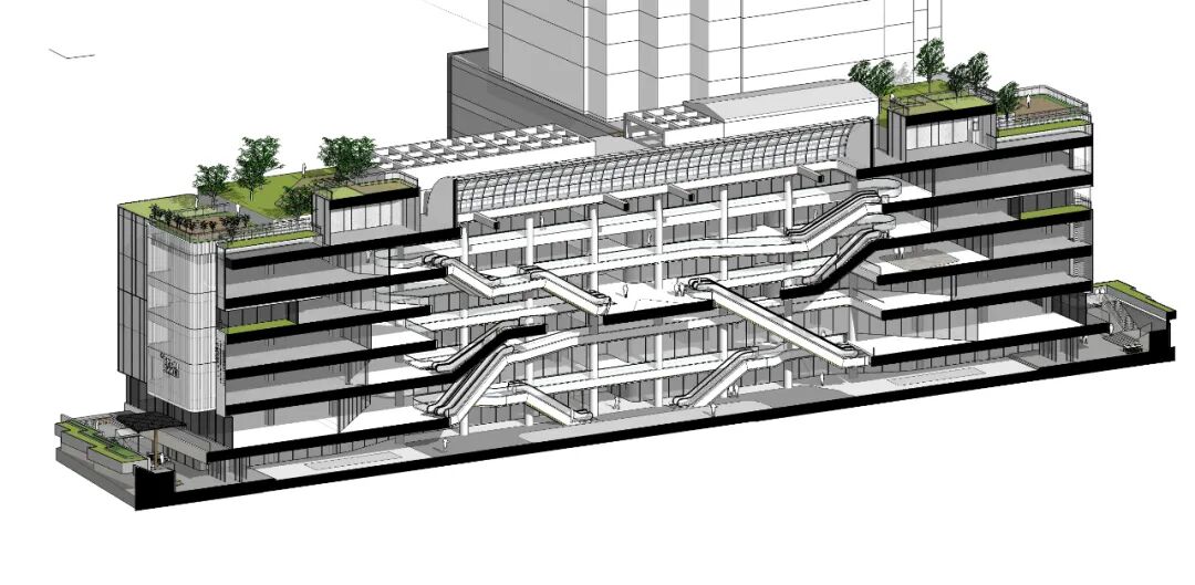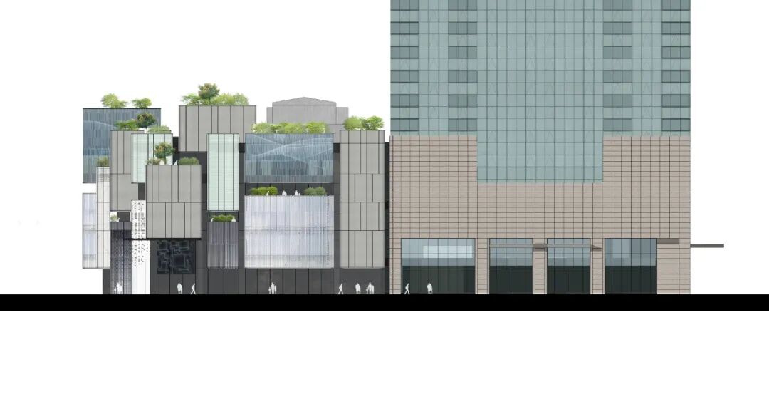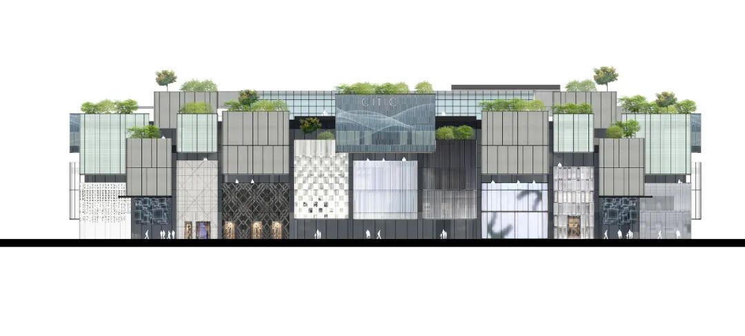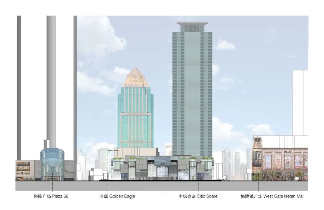 下沉广场和空中花园进一步模糊了私人和公共空间、中信泰富广场和上海这座城市之间的界限。其中包括每个立面像素盒子顶部的露台,通过其独特景观,显著地增强了商业空间对购物者的吸引力。改造前的屋顶原本用于置放机电设备,现在成为了主力餐饮租户的户外用餐区及广场户外活动区域。为了扩大购物中心的占地面积,在东侧设计了双下沉式花园,这也是对现有西侧花园的对映,可以激活聚焦生活方式的地下空间的流动性。
