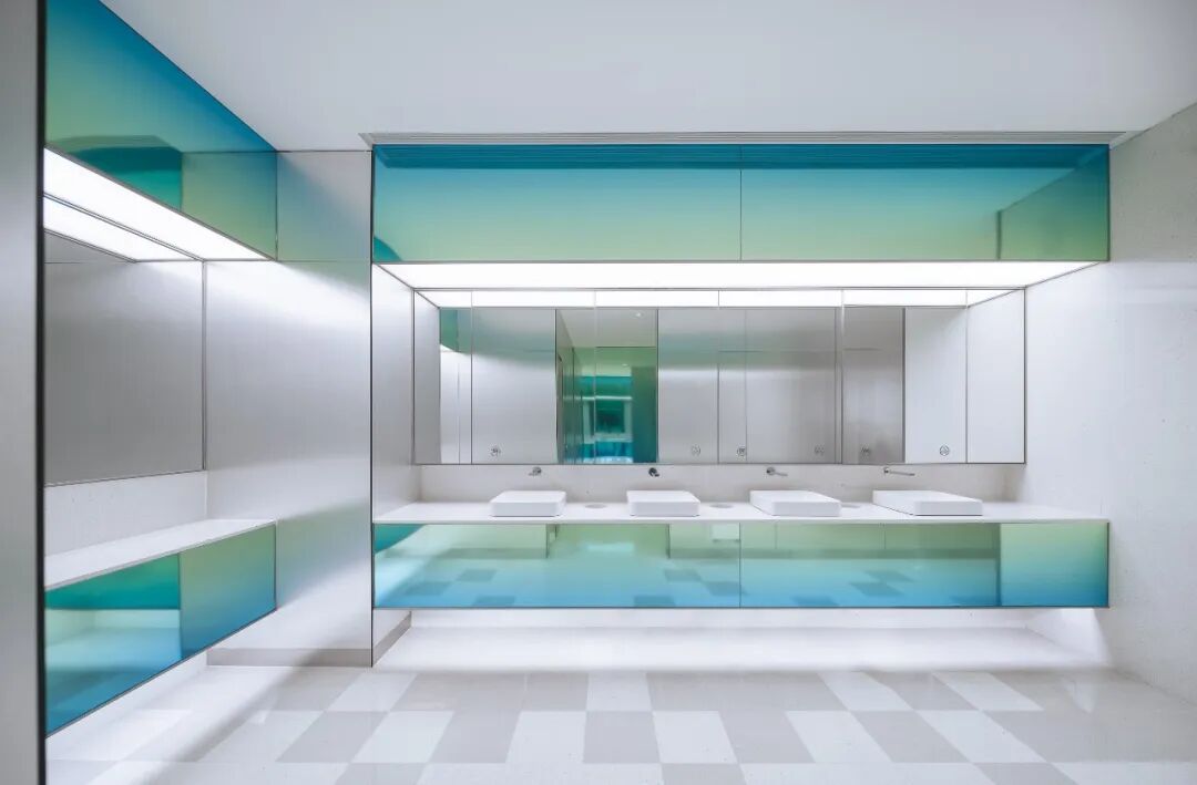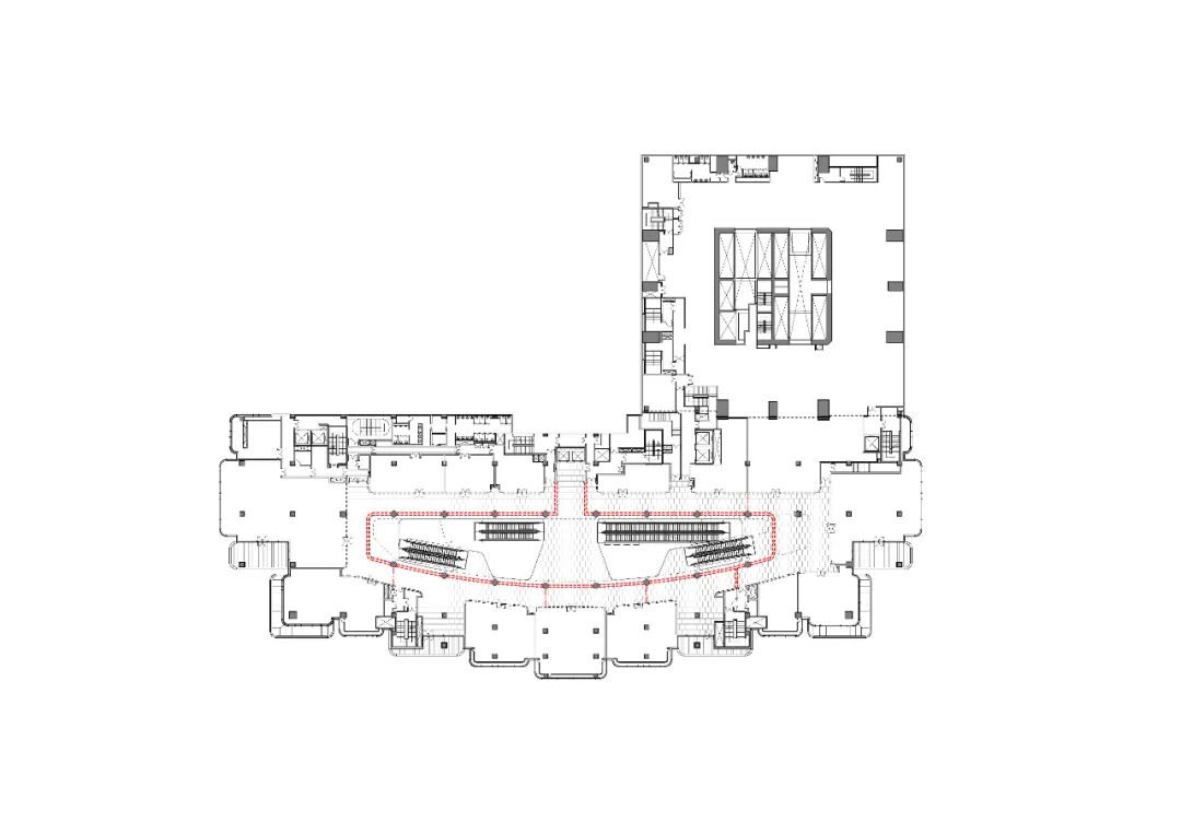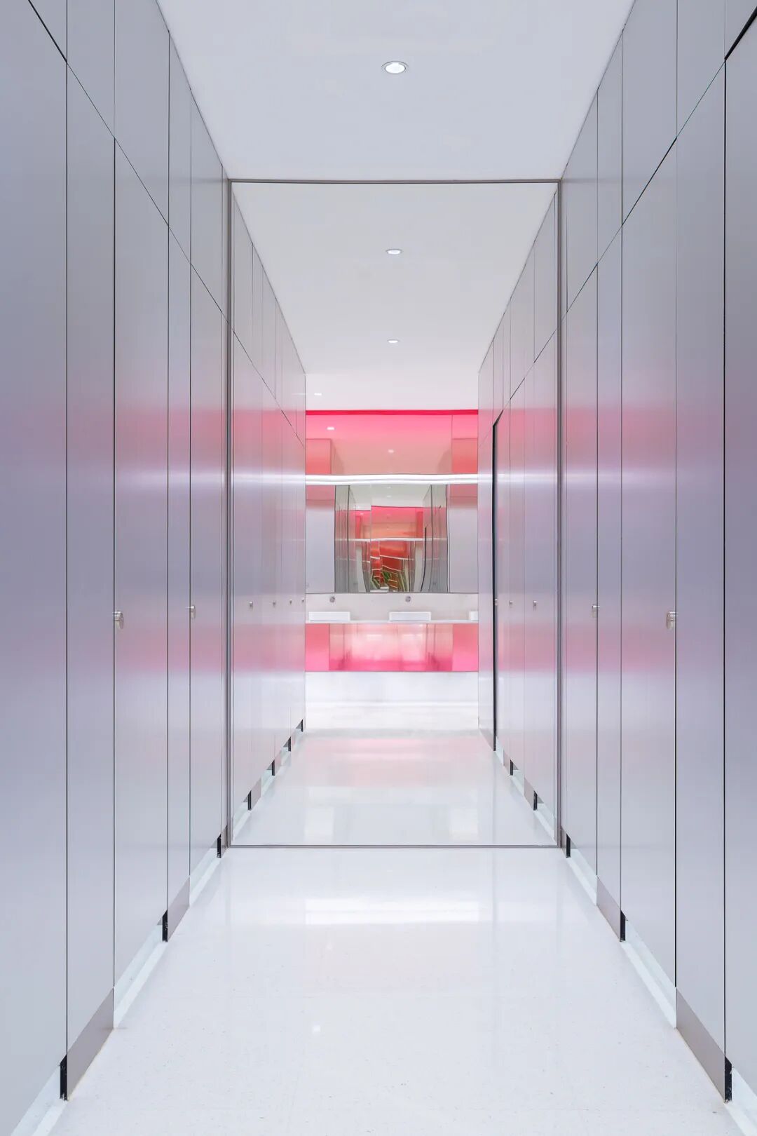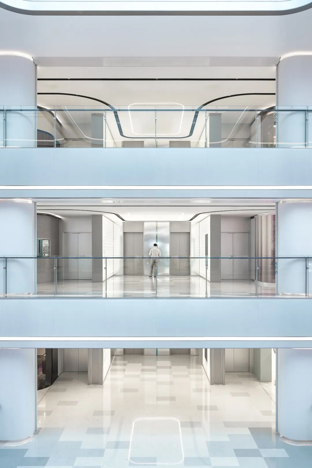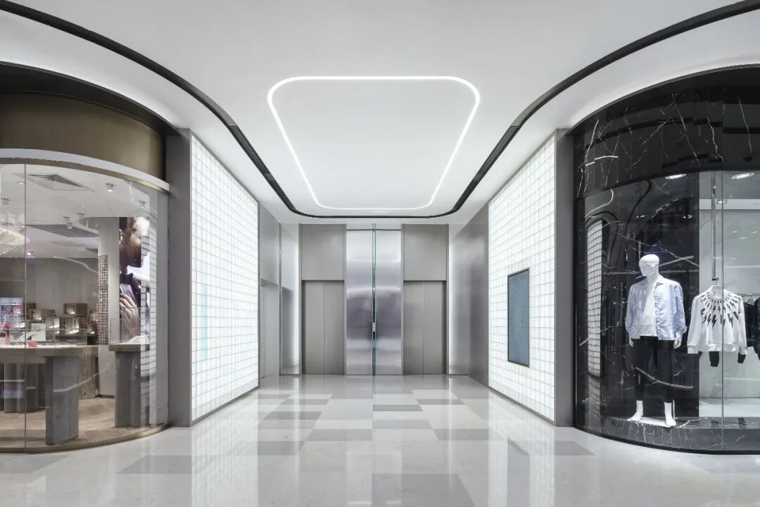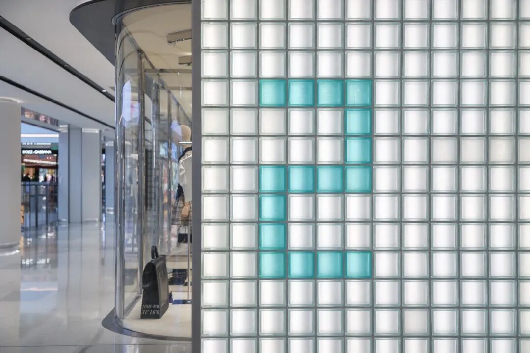 如同是跟随购物者的双重流线一般,可定制的LED屏幕以无限循环的方式贯穿整个中庭,让商城成为一个全新动态的多媒体空间。它们仿佛是脉动的数据流一般,将中信泰富广场的像素主题强化为充满未来感可读可观的效果。同时,在引人注目的电梯大堂中,玻璃砖墙壁上的像素化数字也再次强调了设计的概念。