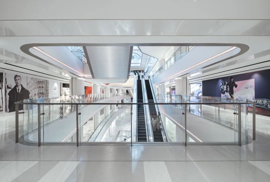 打破传统大型购物中心的设计方法在室内改造中依然奏效,从前巨大的中庭被如今的夹层空间分解。较低楼层允许租户定制化设计商铺立面,保证了更好的光线控制调节,而低楼层的餐饮与高楼层的时尚购物旅程,也为来访者创造出两种截然不同的氛围。改造后的两个入口处的自动扶梯可以让游客从上至下自由游弋在整个空间中,而入口设计也前置预测了来访者可能的目的地。例如,东侧入口靠近南京西路地铁站,于是东入口通向生活方式空间;而西侧入口靠近附近的奢侈品购物目的地恒隆广场,因而西入口将引导人们去往主题相似的高端时尚空间。