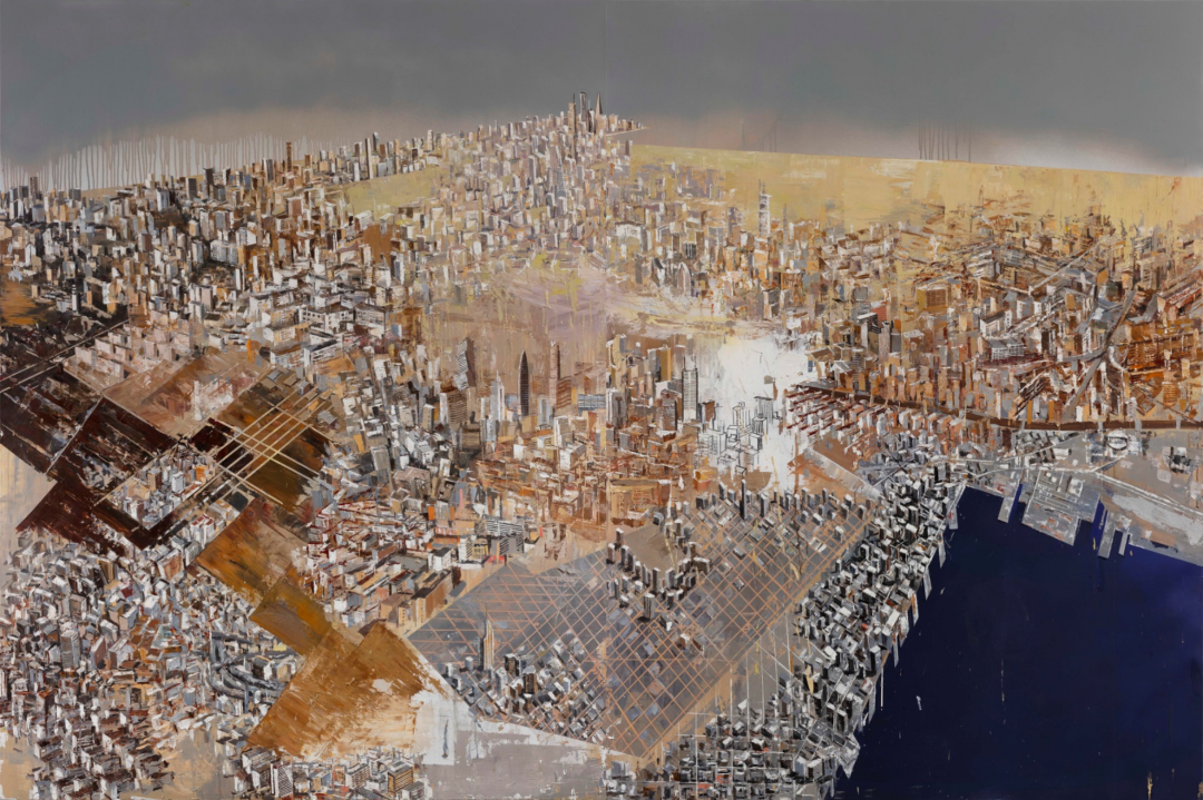 画面以一种具象与抽象相互切换的方式呈现,其中的城市即是现实中的图景又或是非现实的,即是具象具体的同时又是不可辨的模糊的,消解城市景观的真实性,呈现一种未知的迷幻的城市景象。
