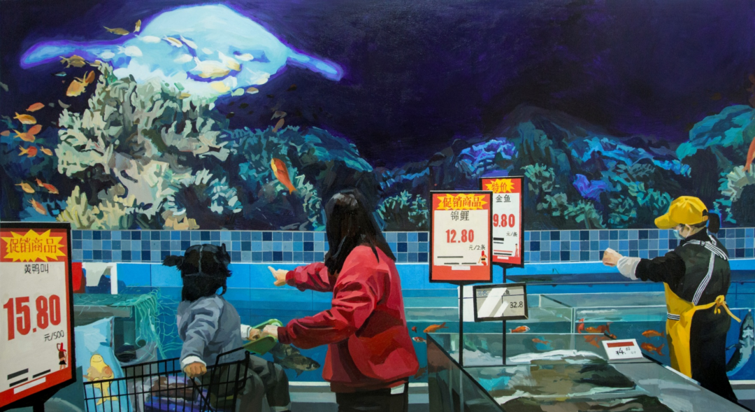 作品来源于生活中的灵感,超市是一个充满生活趣味、体现人们生活状态的地方。推着孩子的母亲在水产缸前驻足,被电子屏上闪过的灯光吸引。疫情的发生给我带来许多新的思考,暂时的束缚和压抑之后,是否会重回那个海底世界一样的宽广自由之地...