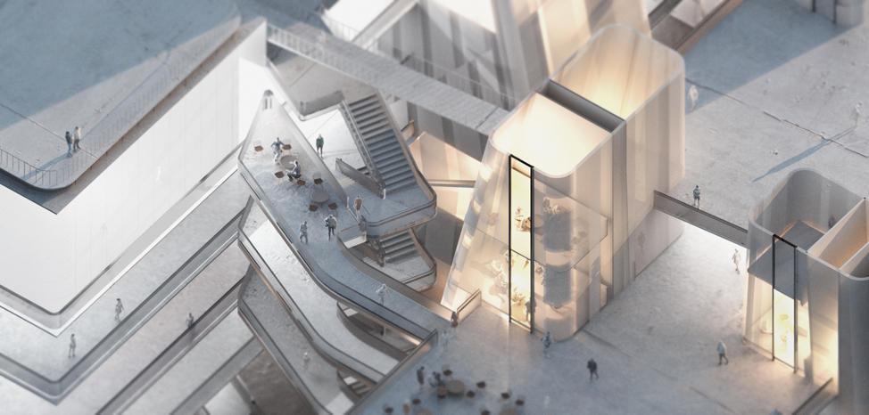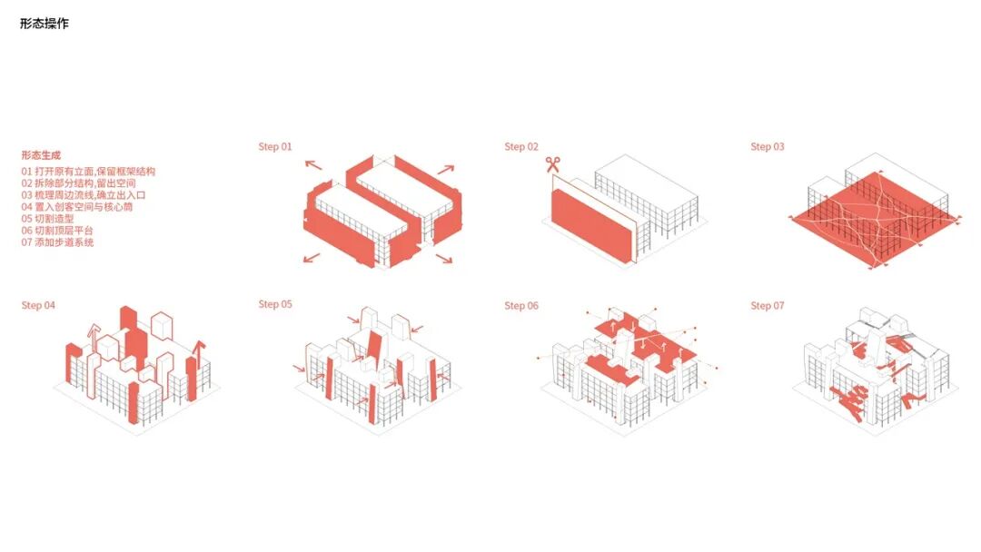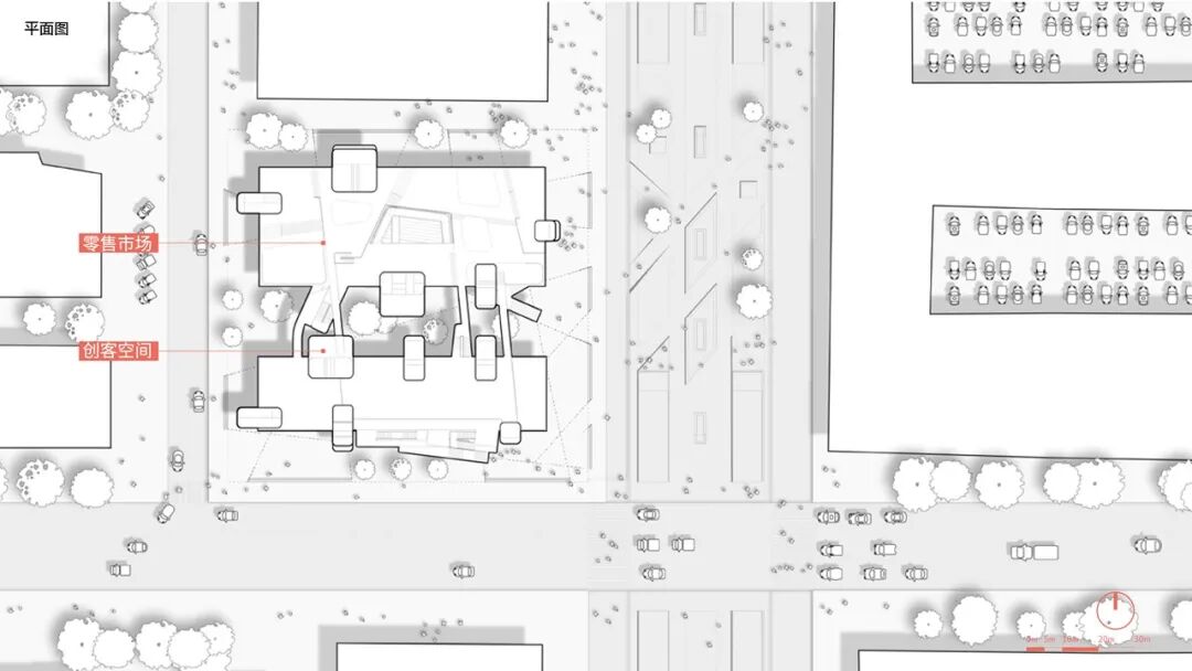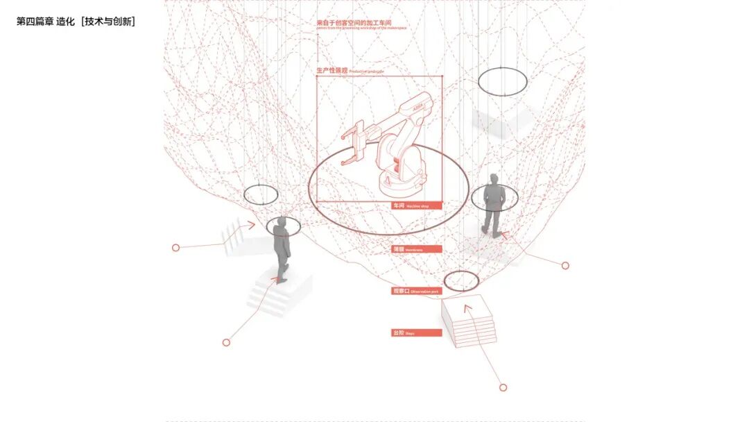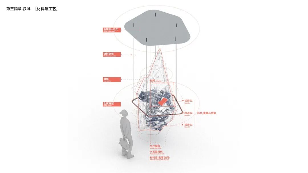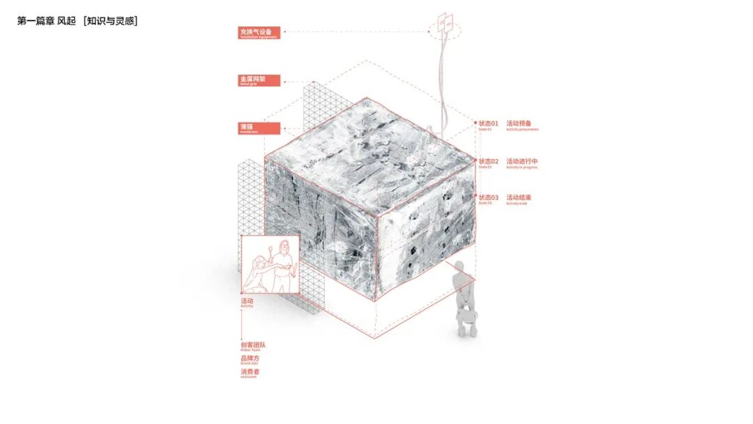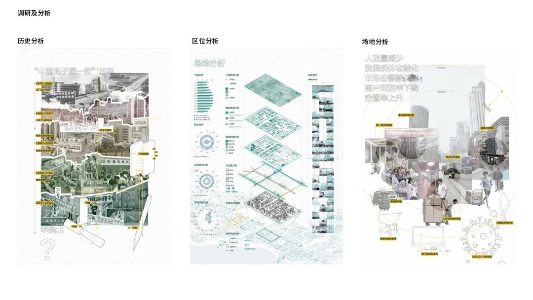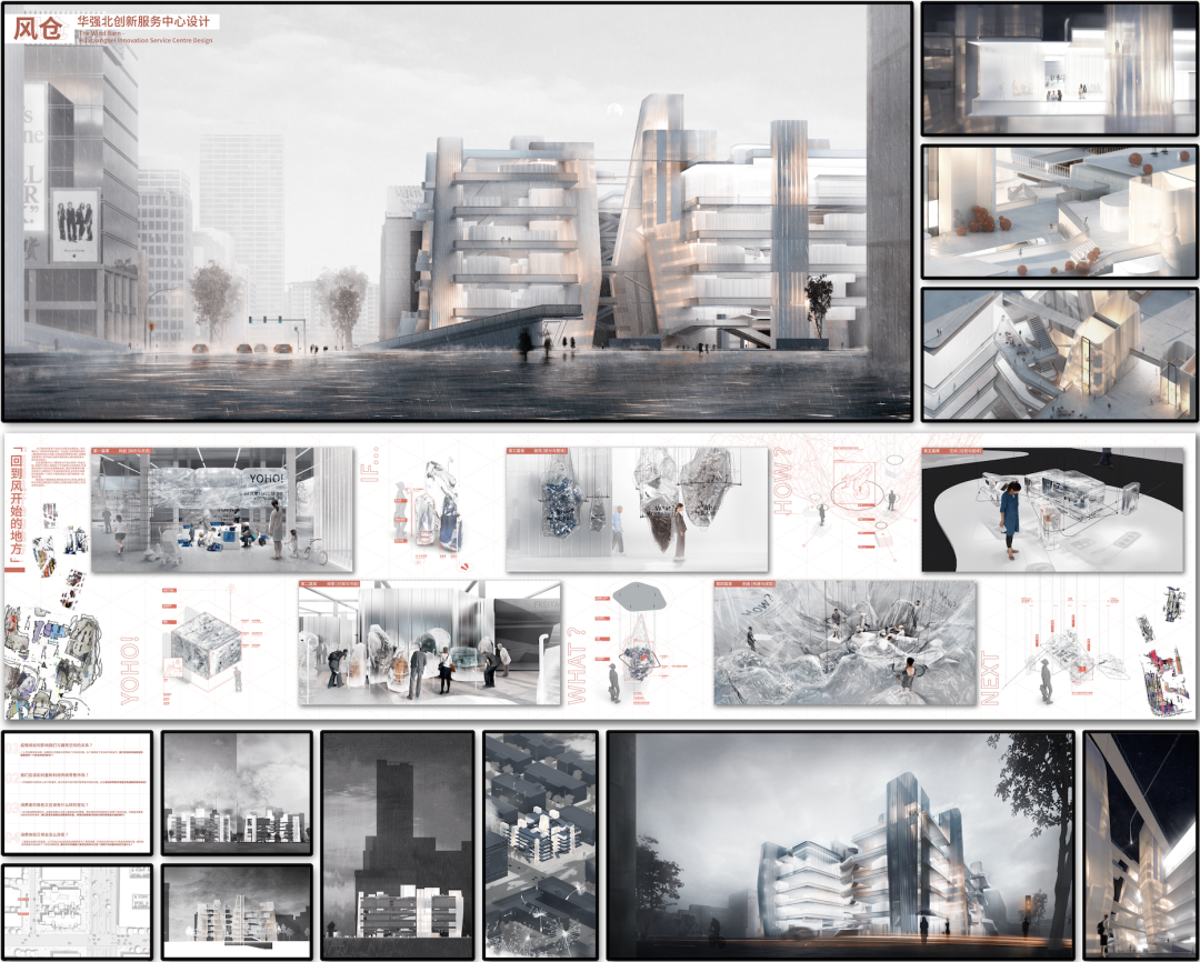 “风仓”方案旨在探索后疫情时代下传统零售市场的未来。以华强北地区的零售市场作为改造对象,该方案尝试结合建筑与展示设计,围绕公共卫生,功能定位,顾客角色,消费体验4个角度进行探讨。该设计打破了零售市场封闭的空间,实现室内外的融合.通过置入创客空间,以创意生产活动与消费活动的结合来重新激活该市场。为了推动消费者参与到共创活动当中,本次展览以”回到风开始的地方”为主题, 空间装置为媒介,试图将消费者带入到华强北创新风潮的源头。