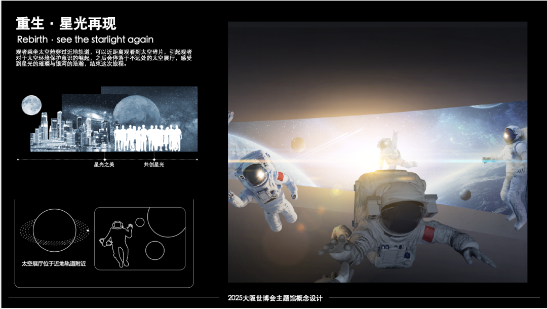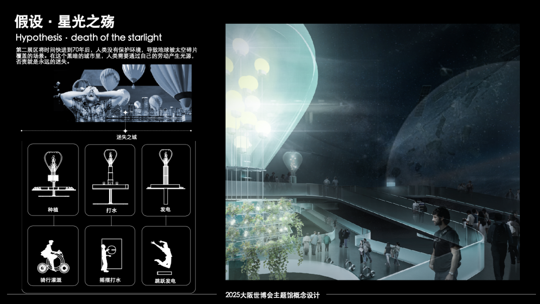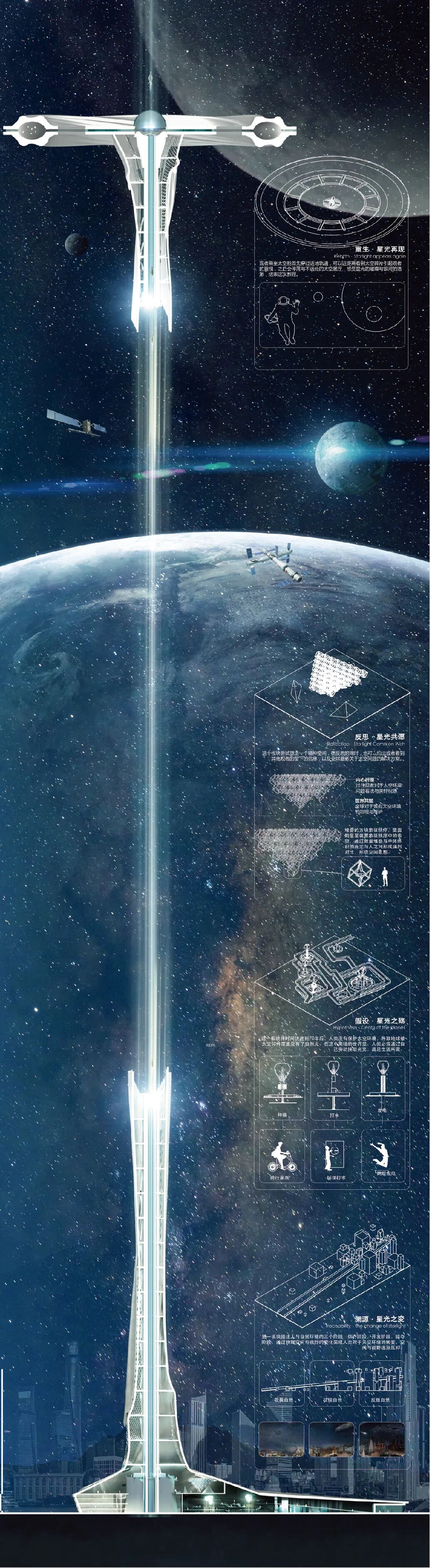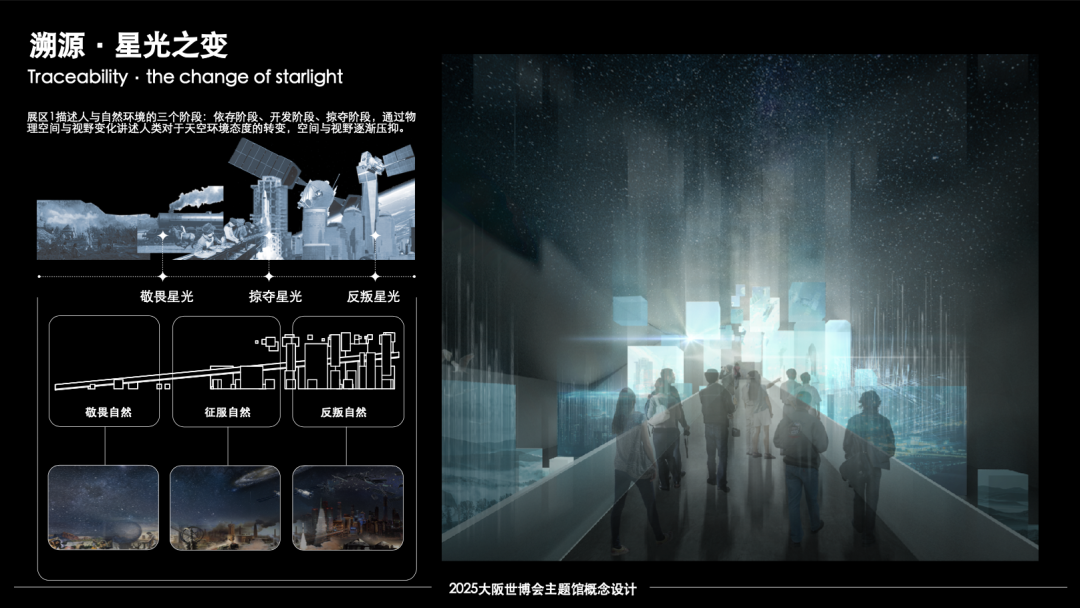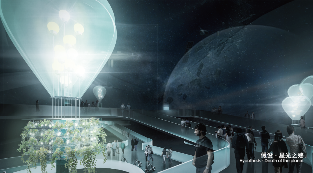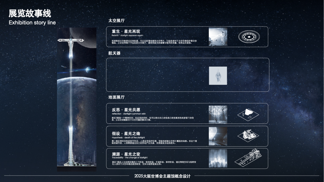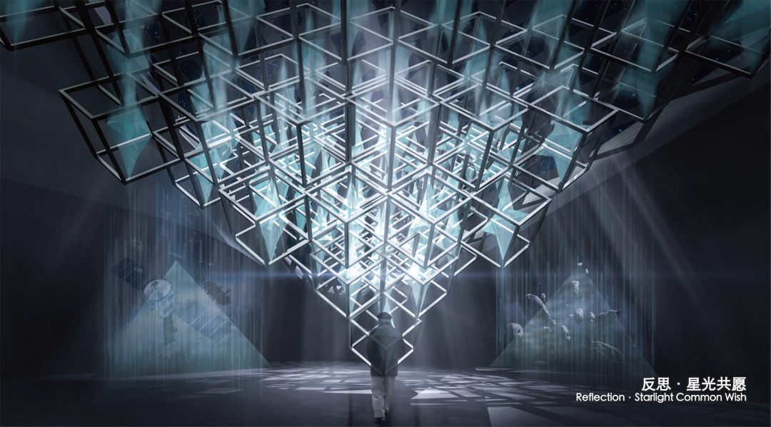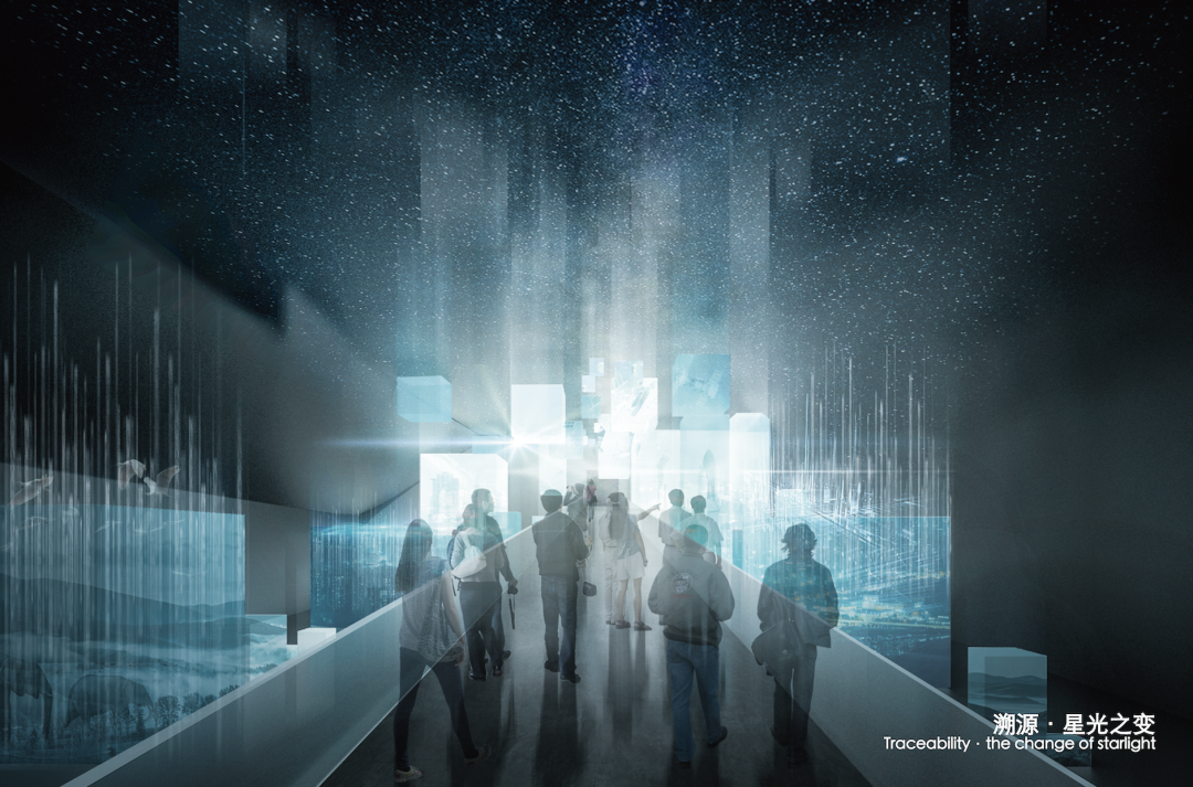 在世博会的大背景下,基于可持续发展这一议题,将目光聚焦于太空领域建造一个永久性的纪念建筑。通过寻找星光作为展览的主线让观者依次经历“看见星光-看不见星光-再见星光”的过程,以此了解太空环境,唤醒保护意识。