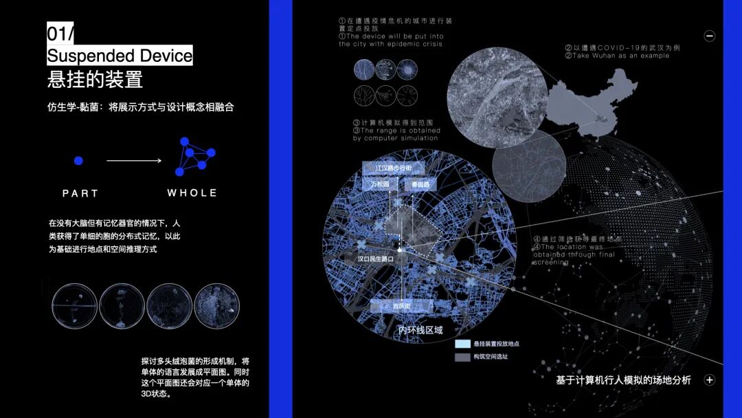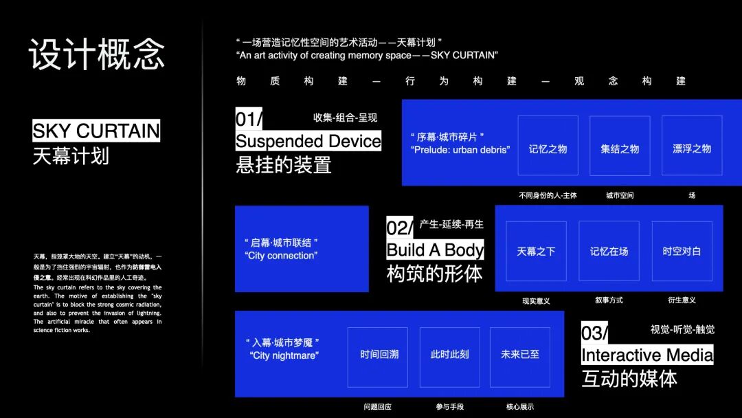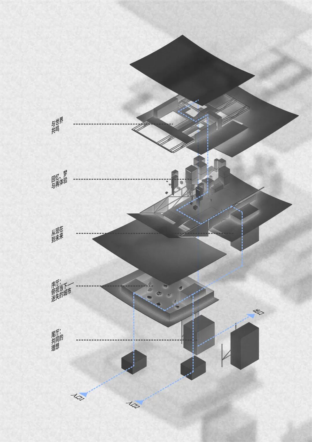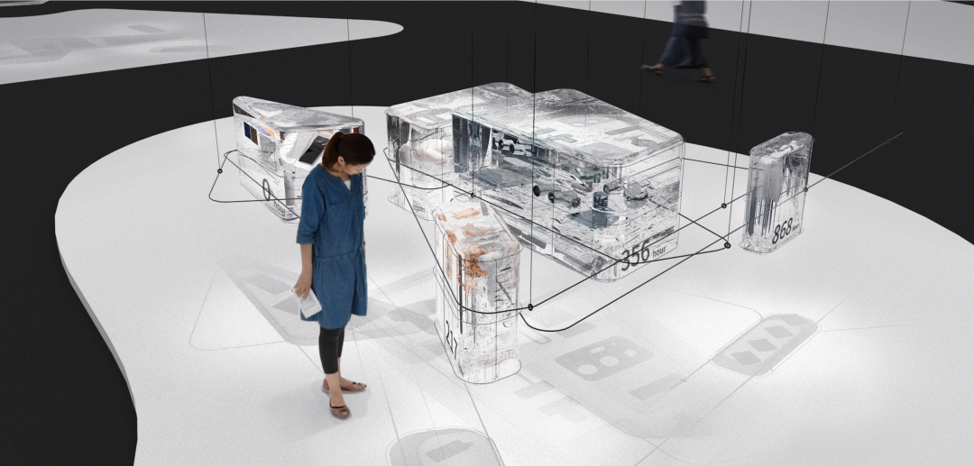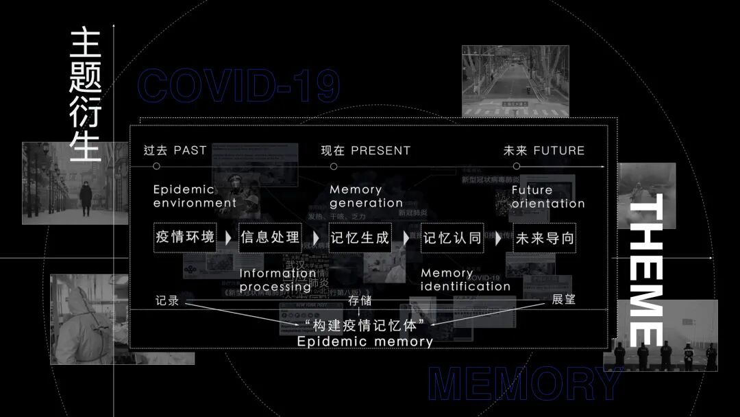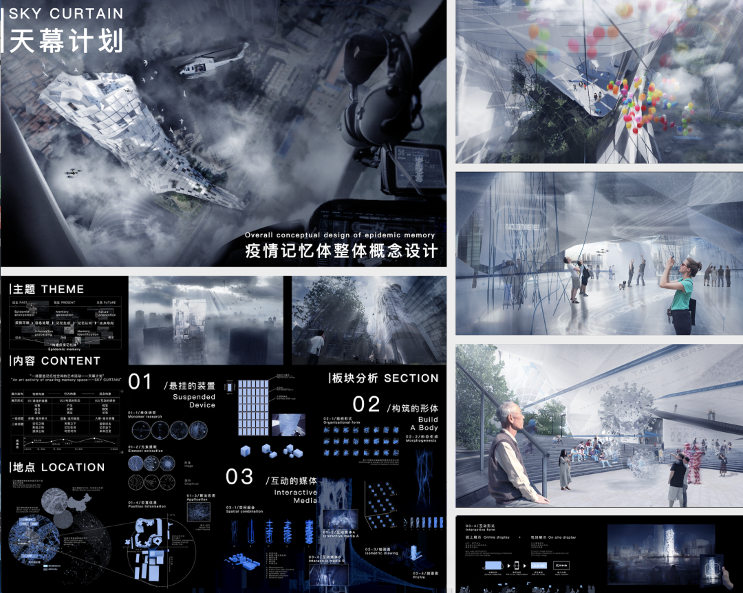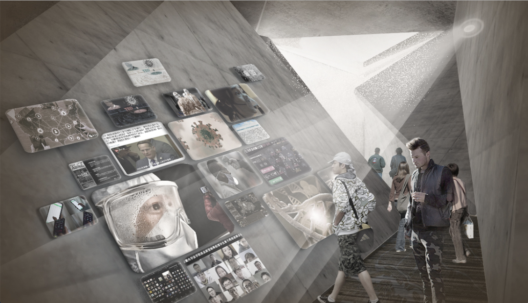 这是一个尝试打破空间展示中时间与空间局限性的概念设计方案。方案中对分散的材料进行收集和重新排列,组合生成新的记忆性空间。并通过具有流动性的展示方式,扩大展示计划的辐射范围。从而提供给更多的参观者进行记忆重现与构建的场所。展示计划以“悬挂的装置”、“构筑的形态”、“交互的媒体”三大展示部分组成,从多维度展示疫情记忆体的形成过程。