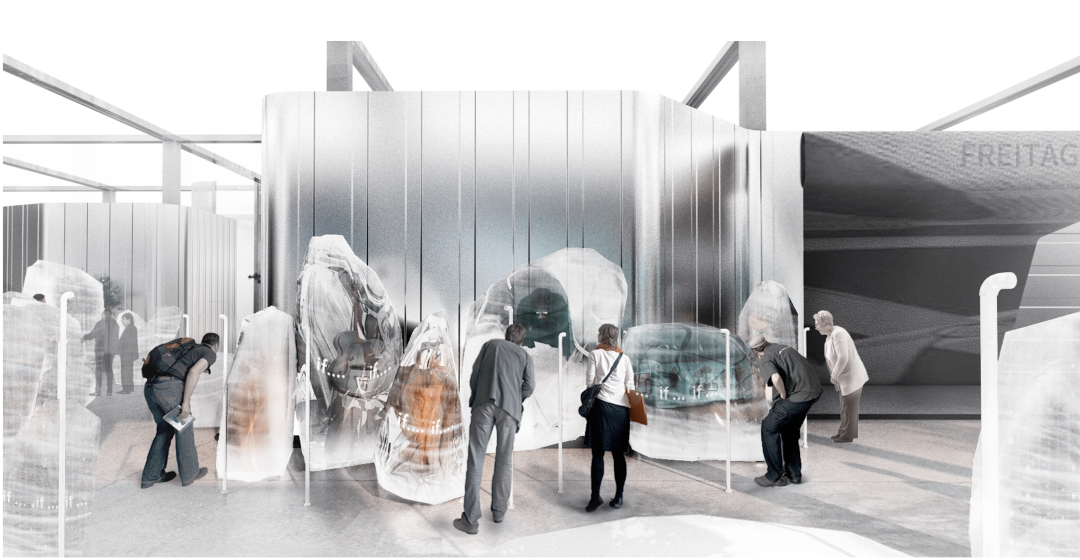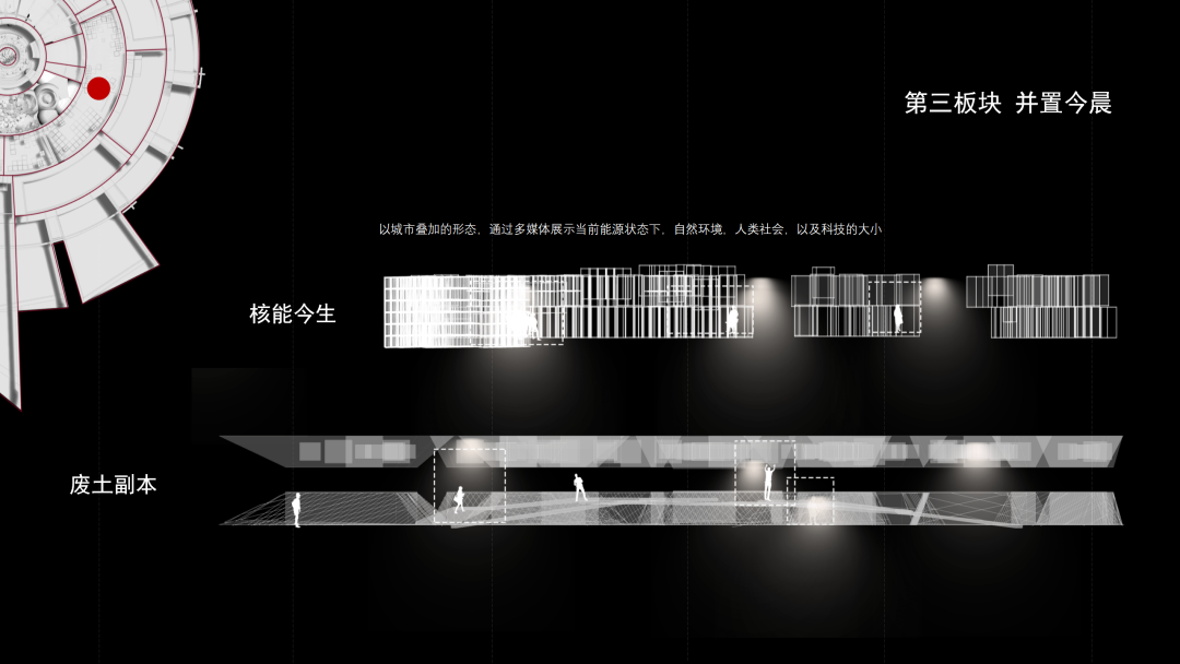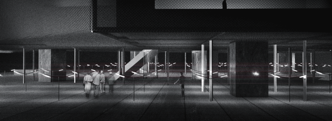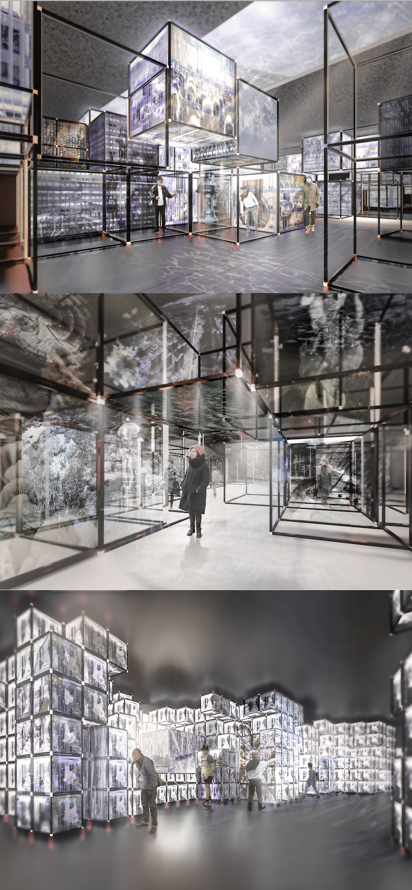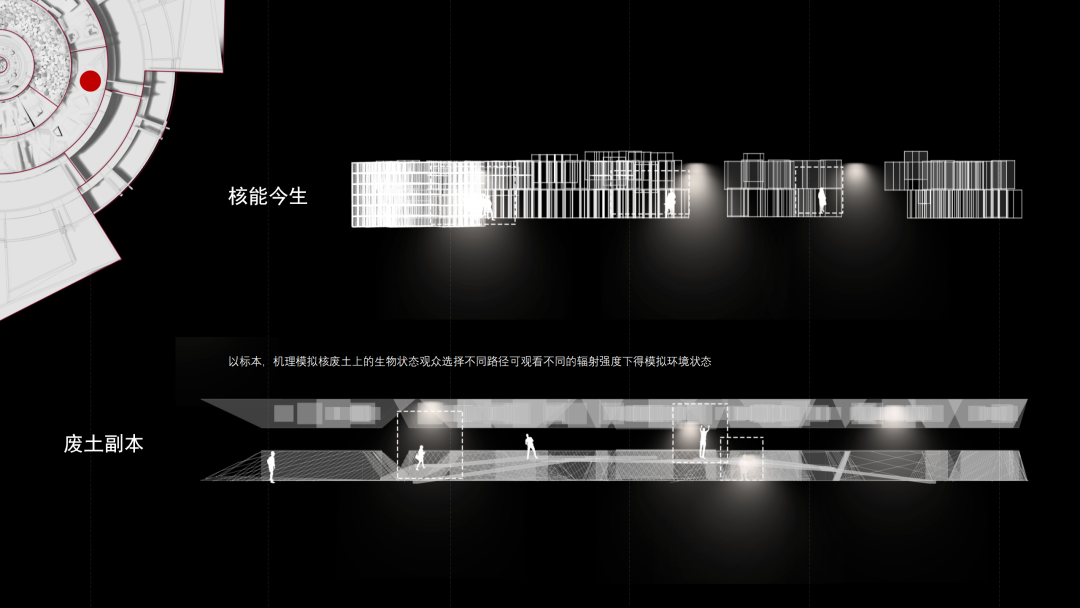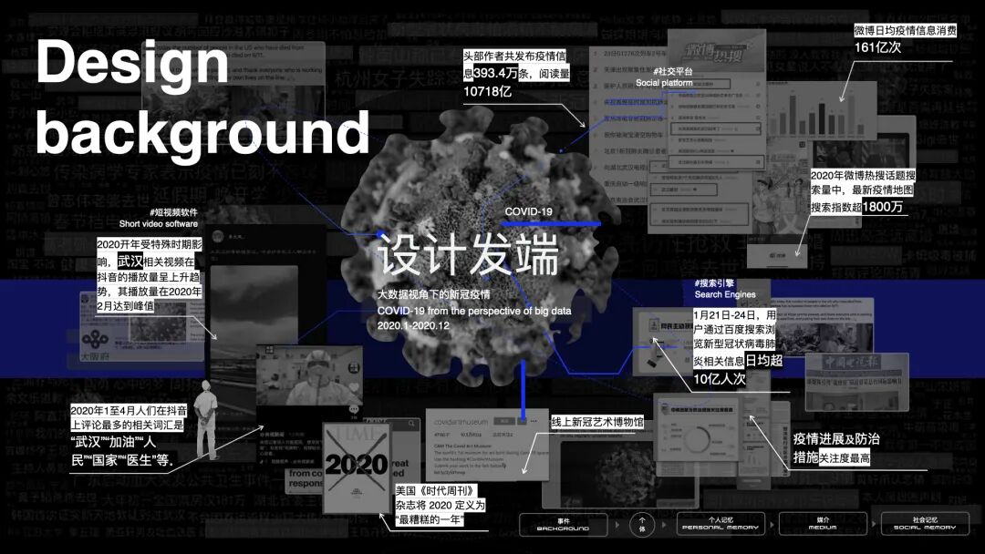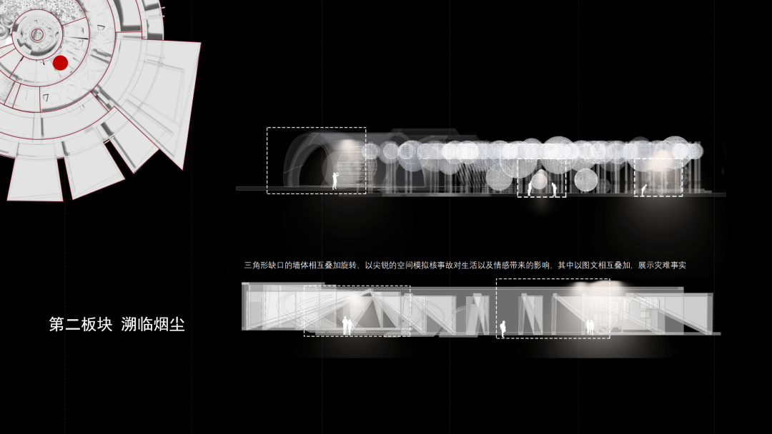 这是一个尝试打破空间展示中时间与空间局限性的概念设计方案。方案中对分散的材料进行收集和重新排列,组合生成新的记忆性空间。并通过具有流动性的展示方式,扩大展示计划的辐射范围。从而提供给更多的参观者进行记忆重现与构建的场所。展示计划以“悬挂的装置”、“构筑的形态”、“交互的媒体”三大展示部分组成,从多维度展示疫情记忆体的形成过程。