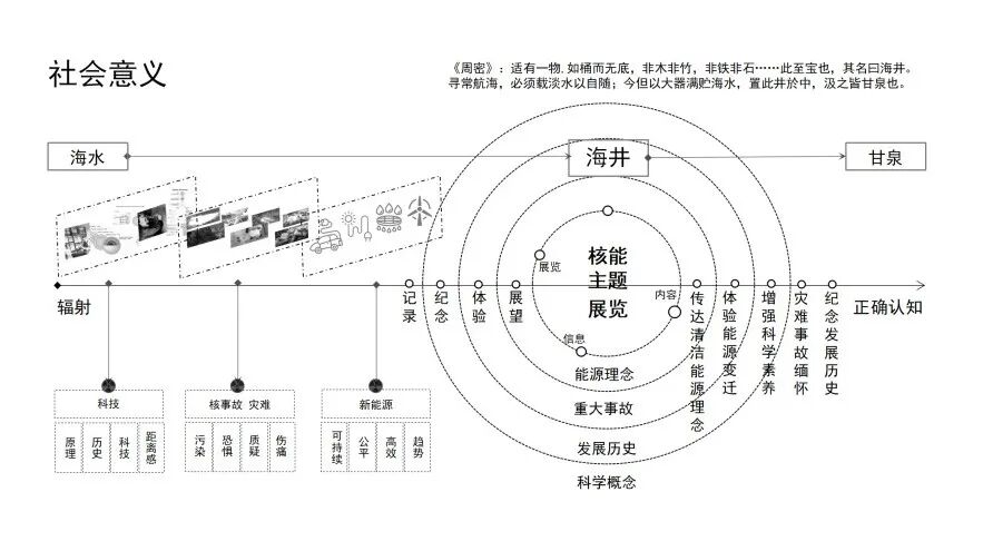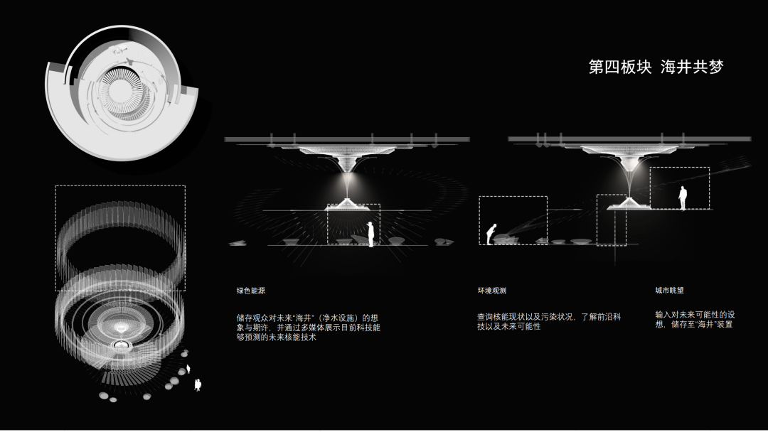 作品是在日本决定向太平洋排放福岛核废水的背景下提出的展览计划。“海井”是《志雅堂杂钞·宝器》中变海水为甘泉的宝器。作品结合核能主题展览与污染物检测处理装置,希望在观众的叙事空间体验中将科技的陌生、事故的伤痛、未来的疑虑转为对核能安全与未来的反思和期盼,形成人与自然环境的共梦之井。