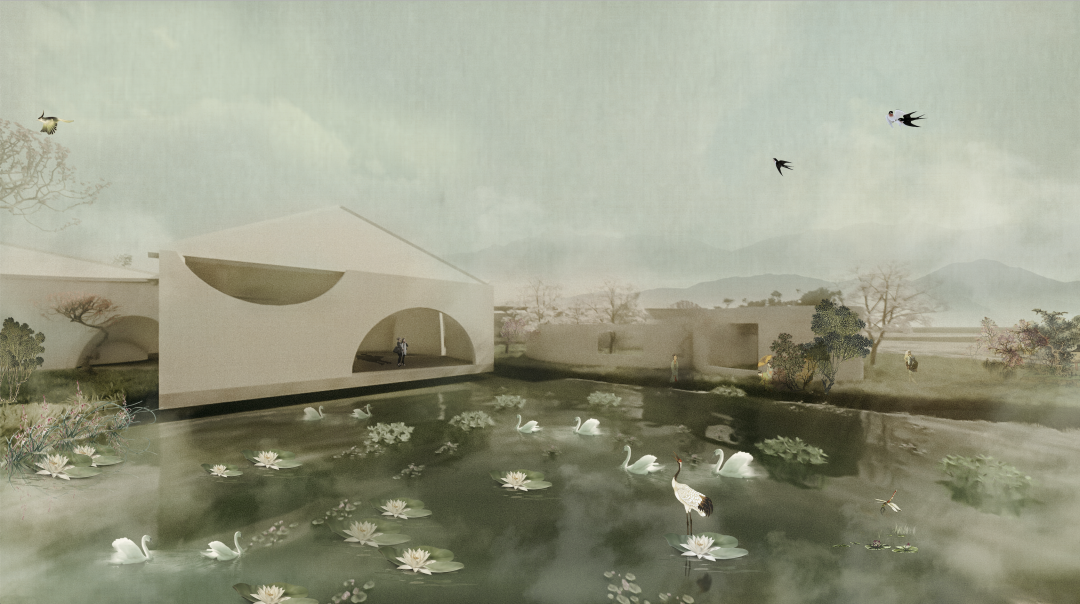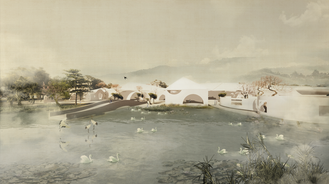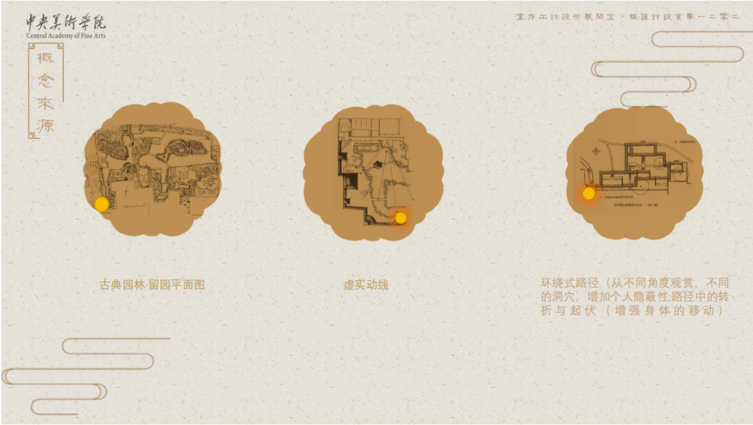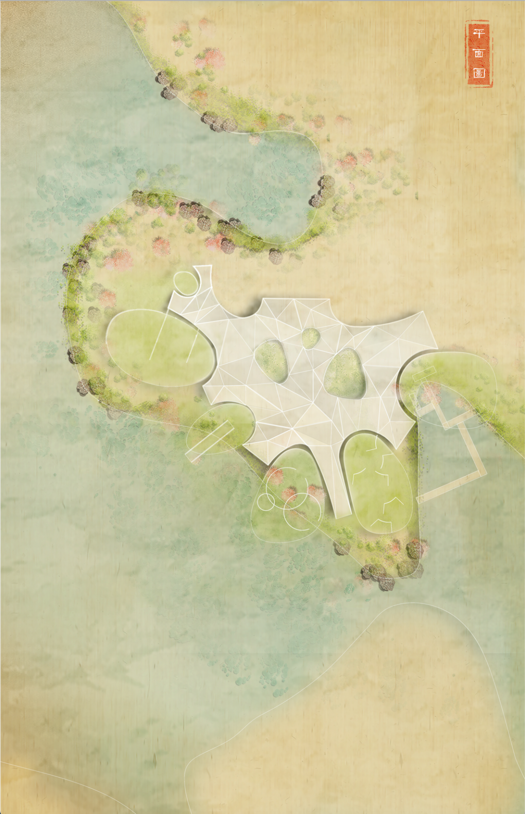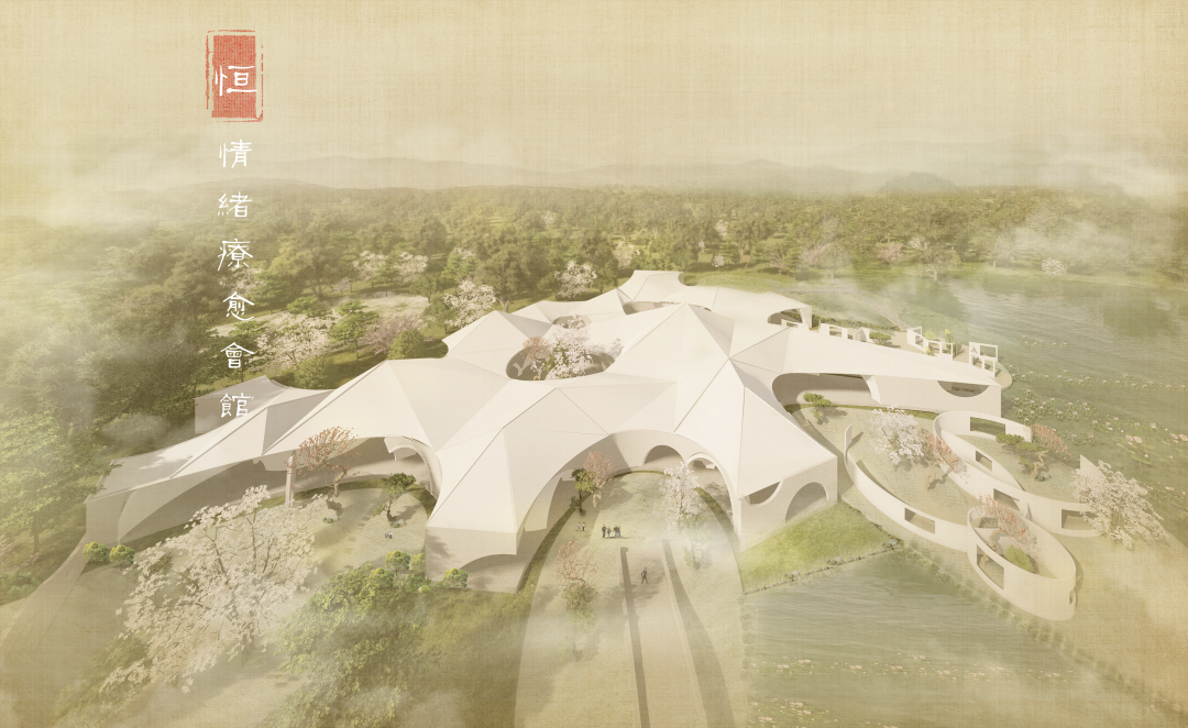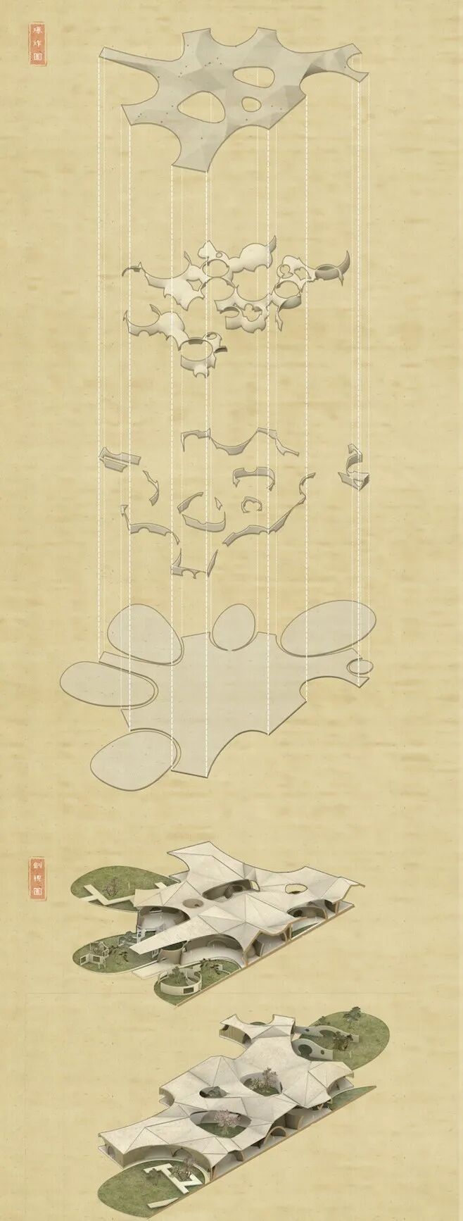当代快节奏的都市生活让人们开始感到窒息,焦虑症等各种精神上的亚健康群体越来越多。更多的人群对于内心和精神上可以得到释放的需求也越来越多,因此也就更加需要一个心灵冥想的栖息地来放松身心、释放压力。干净的空间可以让进行休闲体验、舒缓情绪的人们在优美舒适的环境中与自己对话。中国古典园林空间就传递着这一种宁静的气场,这种干净的东方韵律对于情绪的疗愈极具探讨性。情绪疗愈馆的平面布局和内部空间的设计灵感来自中国古典私家园林中的平面布局、古典建筑攒尖顶与太湖石的造型。围合出一个层层递进、移步换景的空间,既开敞通透又有局部封闭的栖息之地。太湖石的孔洞结构本身就是一种自由的空间路线,人们在焦虑的时候非常容易产生一种需要母胎感的保护感受,太湖石的孔洞空间可以自然交错产生出一种环抱式保护空间,让人可以放松栖息。希望通过建造出一个可以让人们置身其中放松身心的情绪疗愈性空间来让每一个观者处在一个最放松的舒适状态,行看云起、以观沧海。