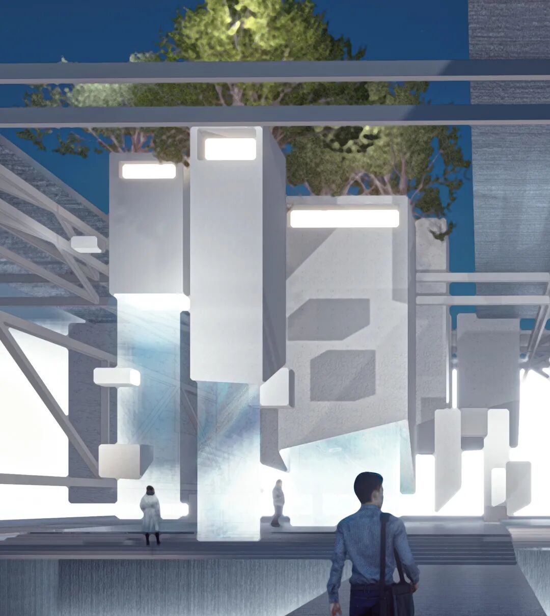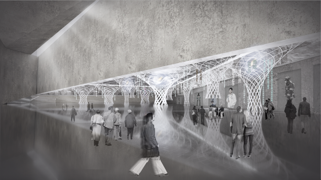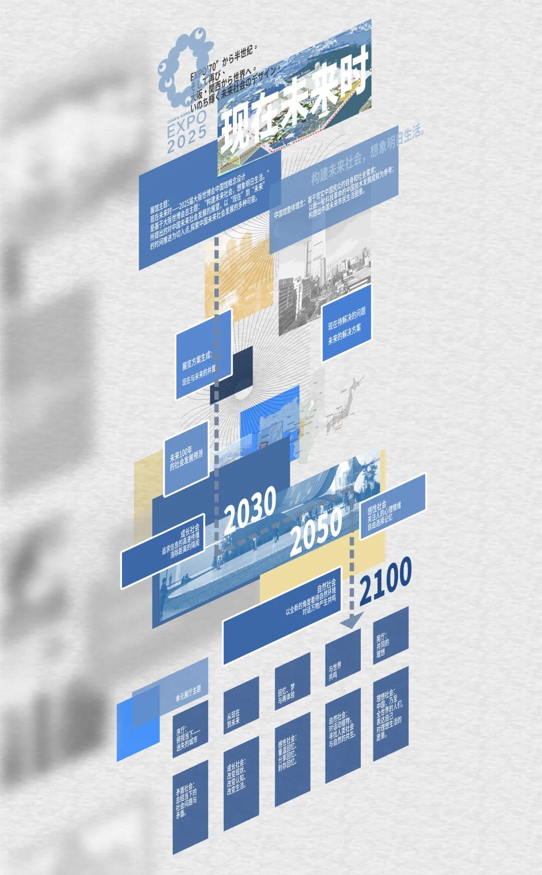 现在未来时——2025大阪世博会中国馆概念设计是基于大阪世博会总主题:“构建未来社会,想象明日生活。”所提出的对中国未来社会发展的展望。以“现在”到“未来”的时间推进为切入点,选取了由近到远数个时段的人类未来社会发展面貌,由此对应到各个展厅之中,探索中国未来社会发展的多种可能。