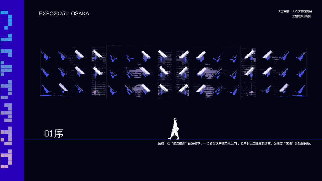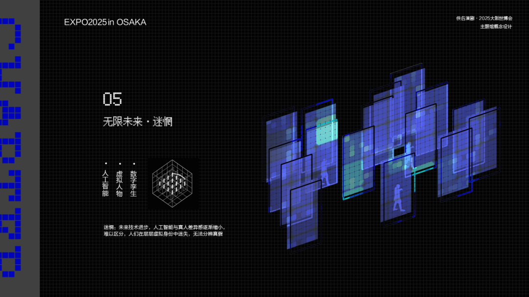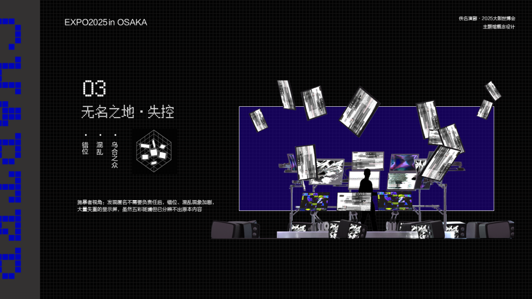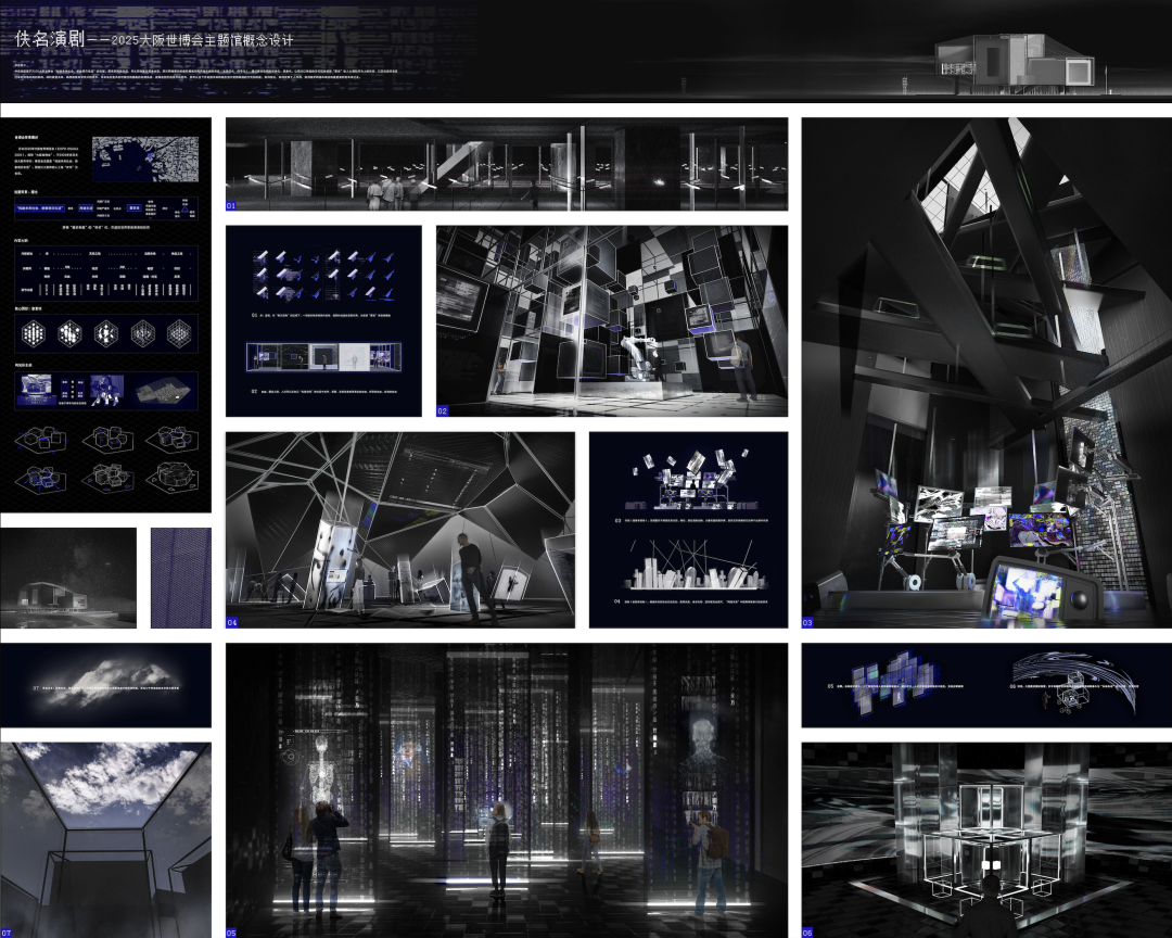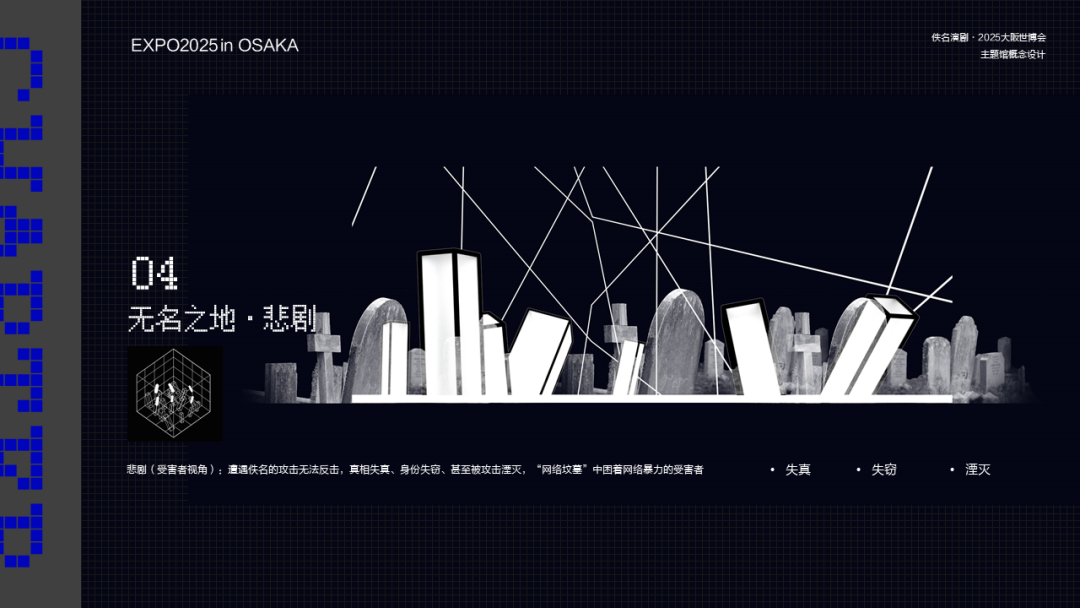 毕设选题基于2025大阪世博会“构建未来社会,想象明日生活”的主题,聚焦到网络生活,并从网络匿名现象出发,探讨网络匿名性虚拟情境对网民身份感的改变(去责任化、去个性化)。通过展馆空间的实体化、具象化,让观众以体验的方式切身感受“匿名”给人心理和行为上的改变,以及这些改变反过来对网络环境的影响。同时展望未来,畅想随着科学技术的进步,未来身份更多的可能性和面临的伦理挑战,呈现问题并提出问题,使观者回归自身思考,思考从当下开始到未来网络生活中使用网络的方式和态度:如何自处,如何发挥个人作用维护网络环境去构建更美好的未来社会。