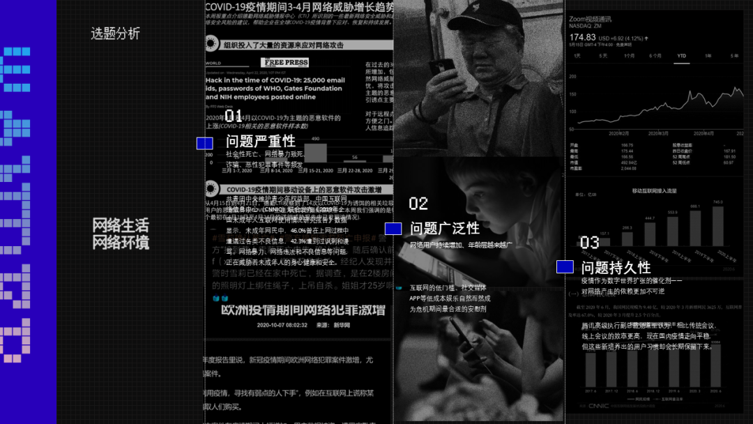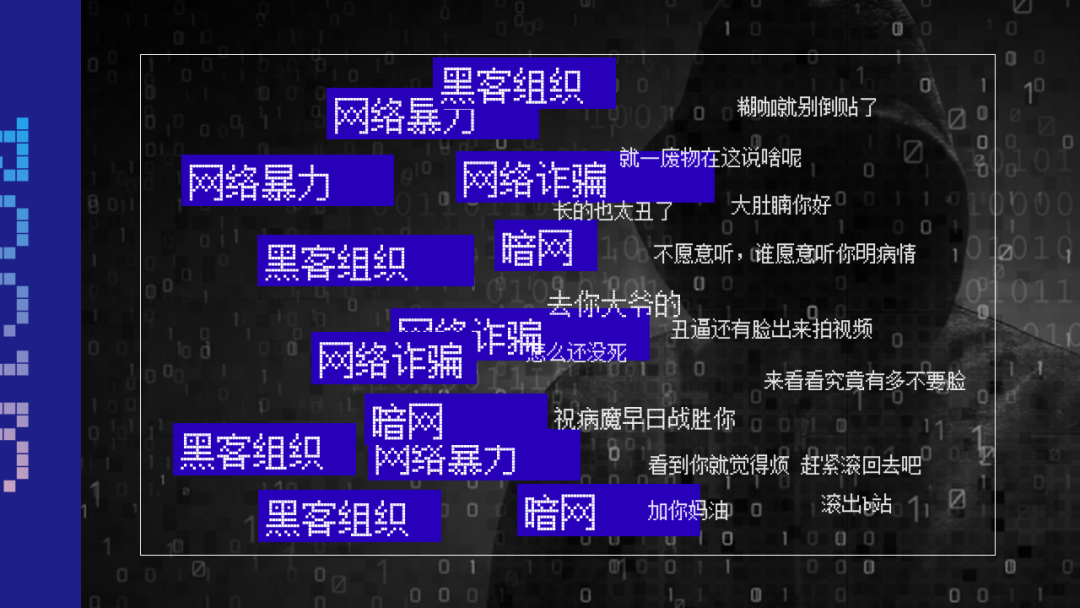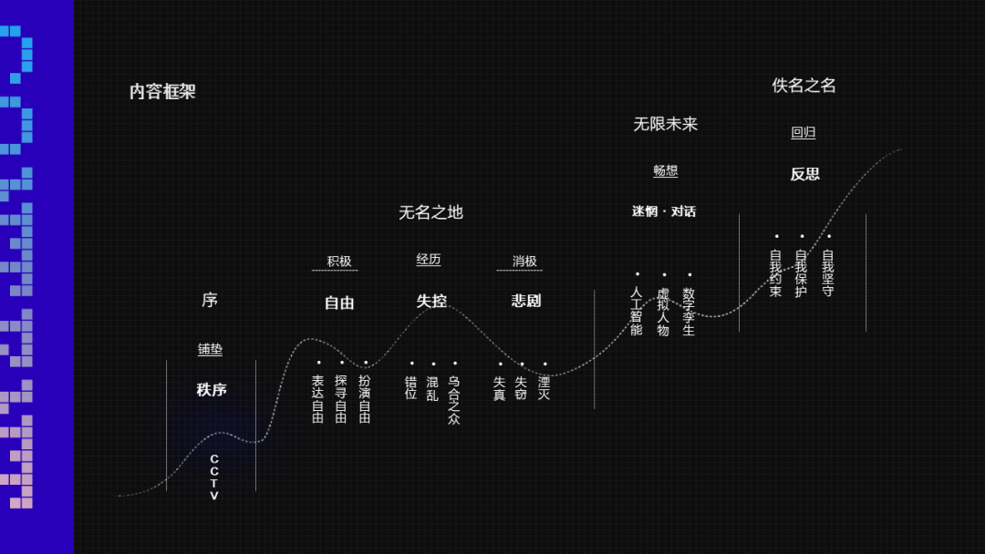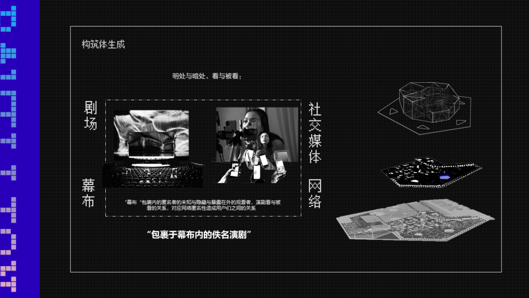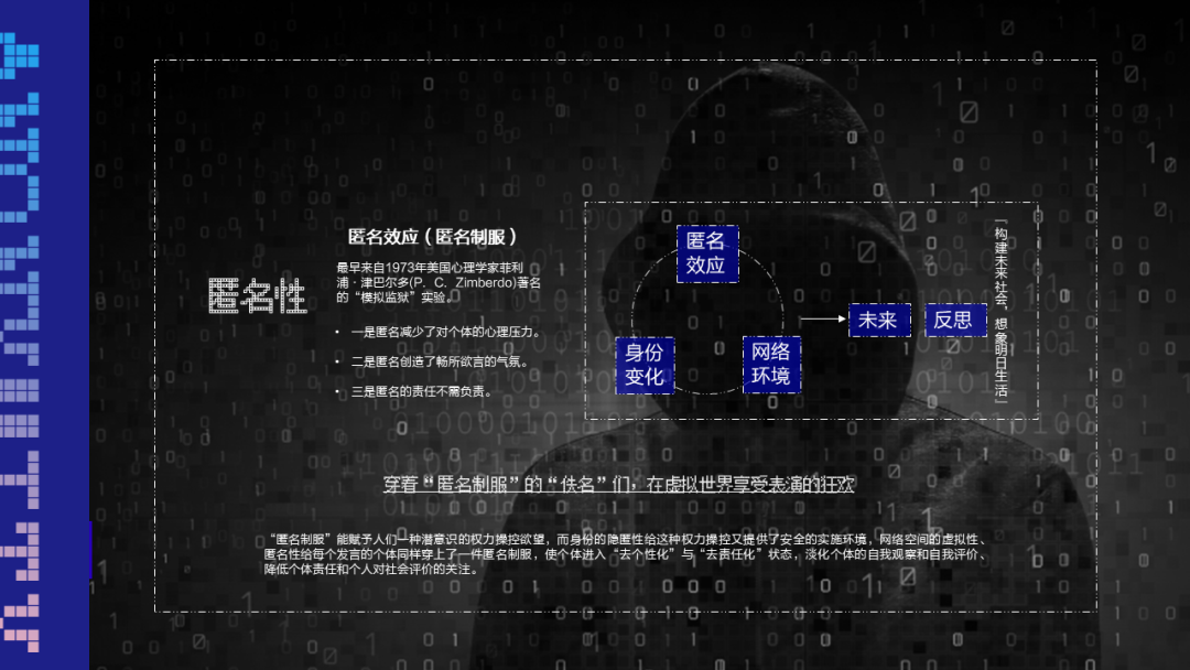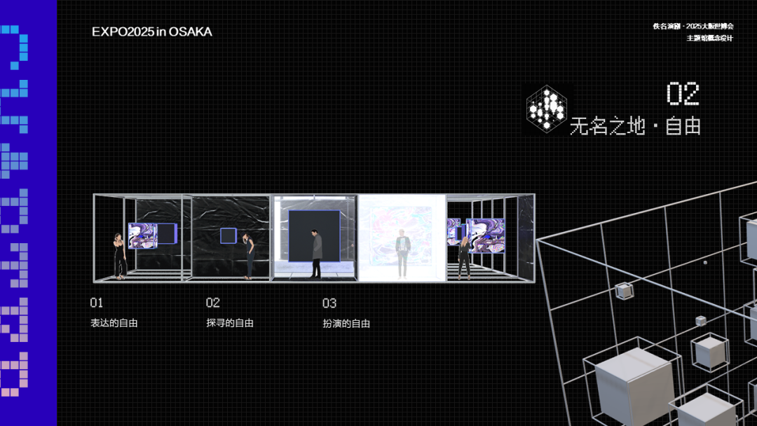 毕设选题基于2025大阪世博会“构建未来社会,想象明日生活”的主题,聚焦到网络生活,并从网络匿名现象出发,探讨网络匿名性虚拟情境对网民身份感的改变(去责任化、去个性化)。通过展馆空间的实体化、具象化,让观众以体验的方式切身感受“匿名”给人心理和行为上的改变,以及这些改变反过来对网络环境的影响。同时展望未来,畅想随着科学技术的进步,未来身份更多的可能性和面临的伦理挑战,呈现问题并提出问题,使观者回归自身思考,思考从当下开始到未来网络生活中使用网络的方式和态度:如何自处,如何发挥个人作用维护网络环境去构建更美好的未来社会。
