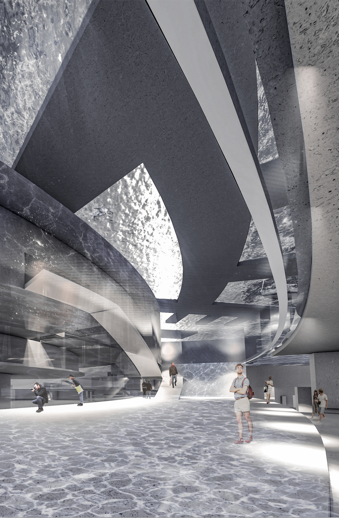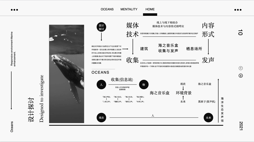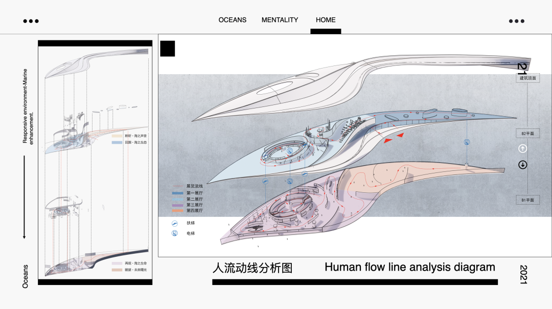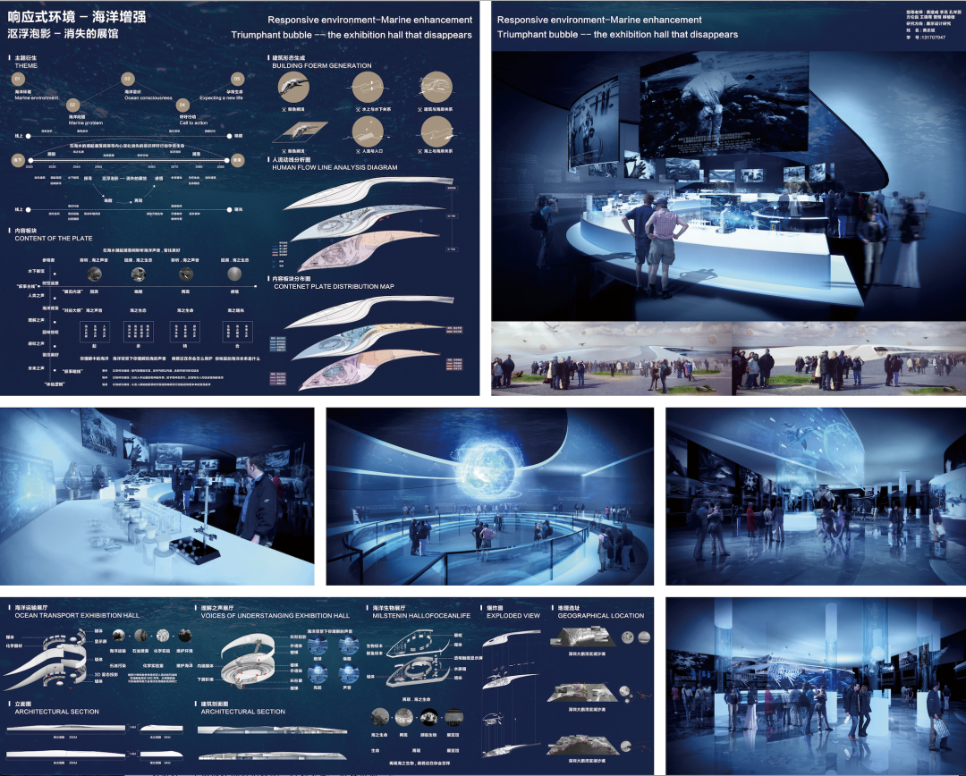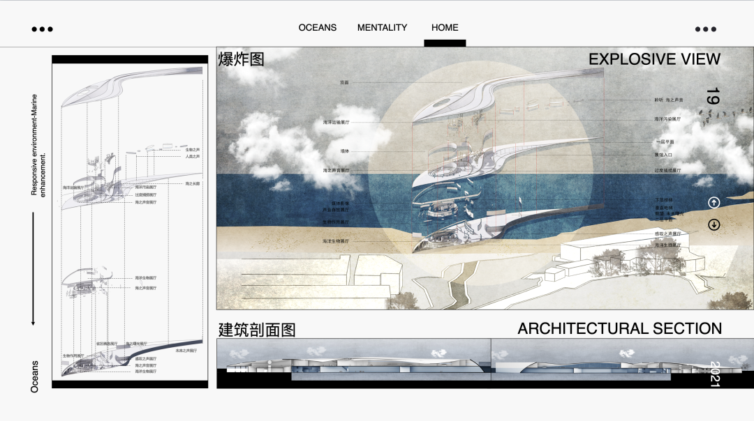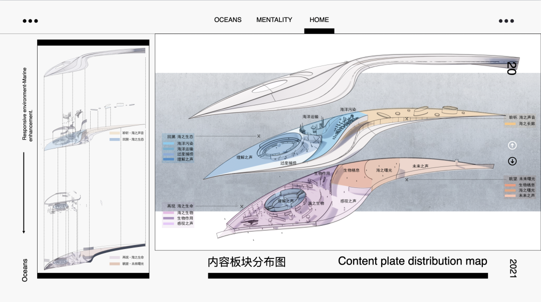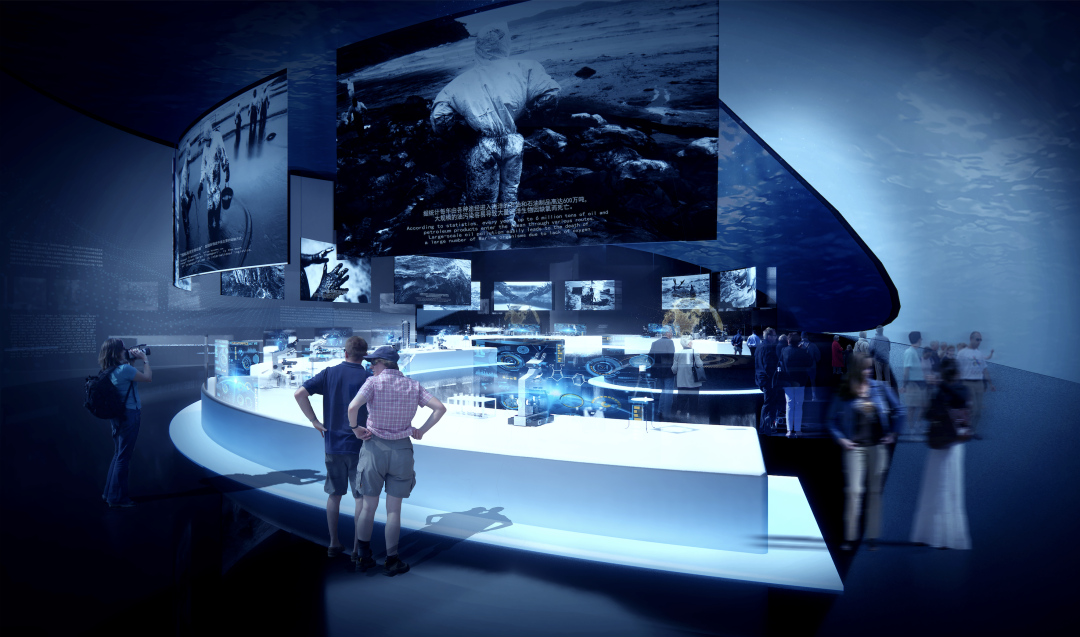 海洋作为生命的起源地,孕育了地球一半以上的生命,而随着海洋资源开发利用,海洋环境问题应运而生,导致一系列极端环境问题。整个展馆以海洋相关消失的事或物作为展示内容,人们可以在这里回溯、唤醒、惊叹、感悟。在海水的潮起潮落间探寻内心深处消失的意识呼吁行动孕育生命进而保护海洋环境!