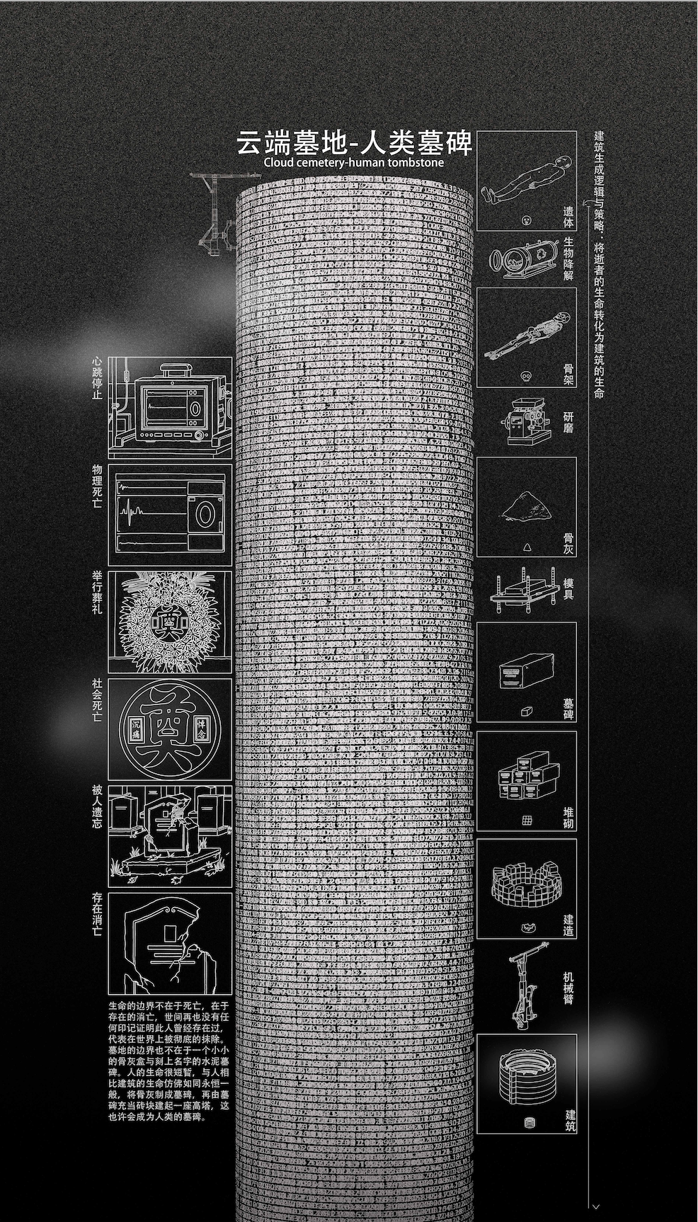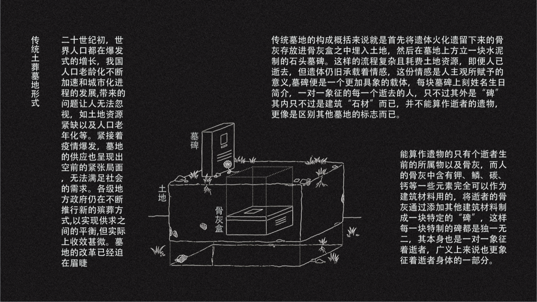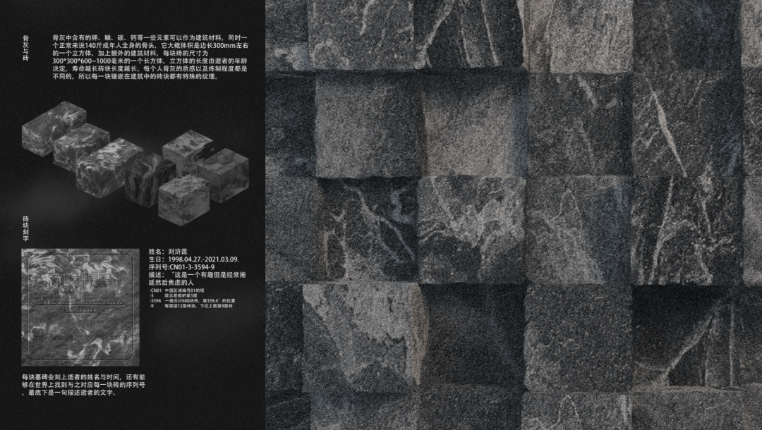 有机生命能否转化为无机生命?建筑的生命若是以人的生命尺度来衡量无疑接近永恒,将逝者的骨灰炼成墓碑,再将墓碑作为材料的砖砌成建筑,逝者的信息被建筑记录下来,人以建筑的形式延续下去,以建筑的形式永生。人与建筑产生新的关系,人既是建筑的一部分,建筑也是人的一部分,建筑是承载信息的载体,是人们生命的记录仪。