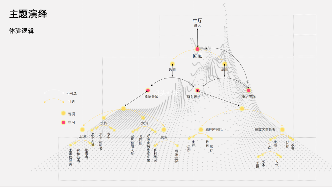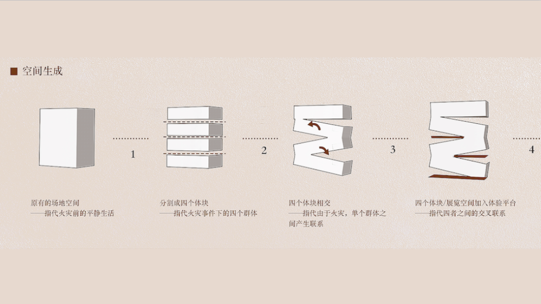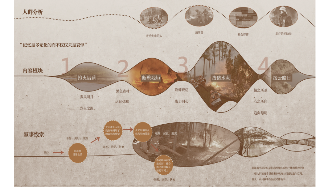 从宏观社会视角出发到中观思考火灾事件本身到微观聚焦消防员三个维度,分析反思个体、集体与自然存在的联系性。纪念馆在记载和呈现事件的过程之外,真正对抗的是人类遗忘的本能。希望人们在一系列感官及空间体验下不再以局外人的视角去感慨灾难,而是真正进入事件。观者在沉浸式体验过程中关注火灾事件的可怕和集体对抗宏大灾难叙事的同时,也能关注灾难后每个个体的情绪和命运,转变固有认知和传统态度,共同描绘人与自然和谐共生的美好未来。