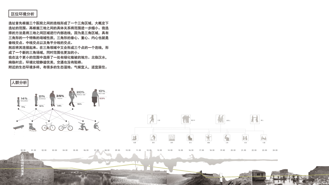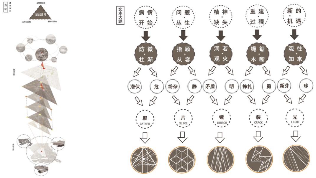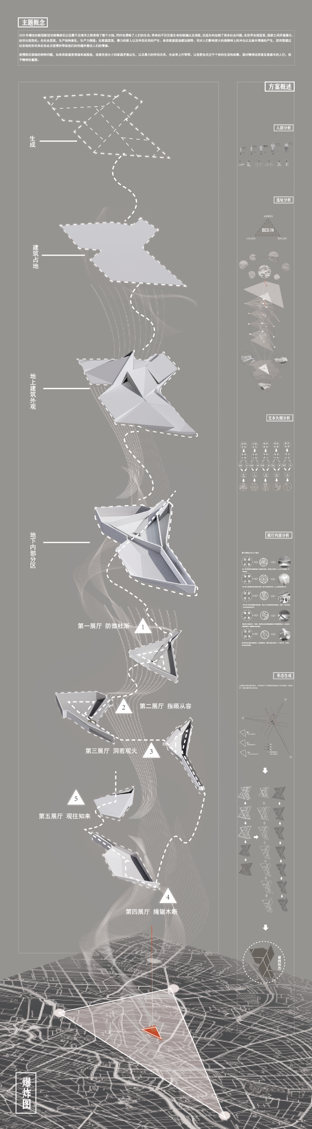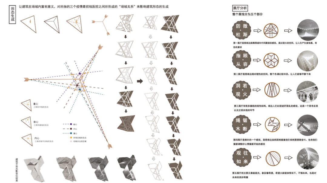 为了纪念2020突如其来的新冠疫情,铭记这段历史。通过叙事的手法令人们产生精神共鸣改变人们精神麻木的状态并营造一个相对独立的社会空间或者说是记忆之场,纪念这段历史的人和物。从三家医院金银潭医院、火神山医院和雷神山医院形成的三角场域到以精神重构作为目的的建筑内部空间,用纪念元素去构建整个空间叙事。关注于当下个体的生活和故事。纪念这次疫情所带来的伤痛的同时激活人们的情绪,感受当下,珍惜当下。