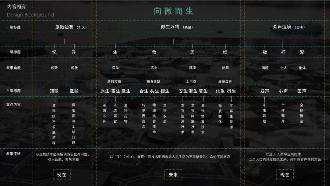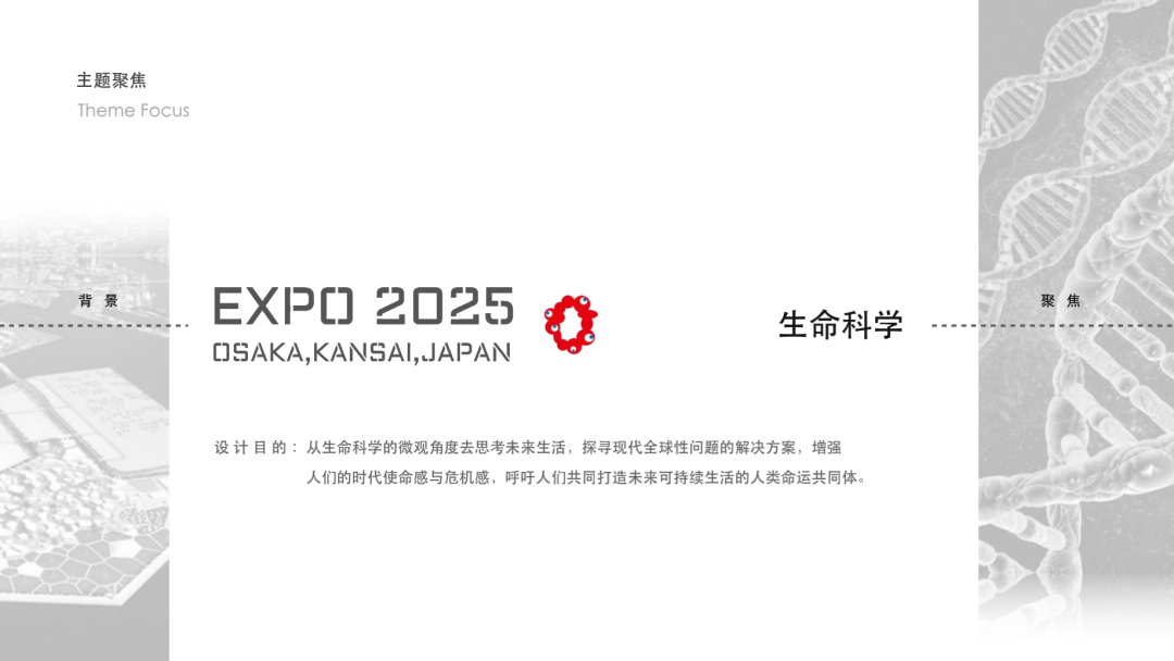 借助大阪世博会的国际平台,聚焦生命科学领域,打造关于未来可持续生活的主题馆,从生命的微观角度去展开未来人类可持续生活方式的畅想,从生命的本源去呼吁人们共同打造人类命运共同体。通过引导观众探索到个体主动发声,使个体与个体,现在与未来发生对话和联结,增强人们的时代使命感和危机感。