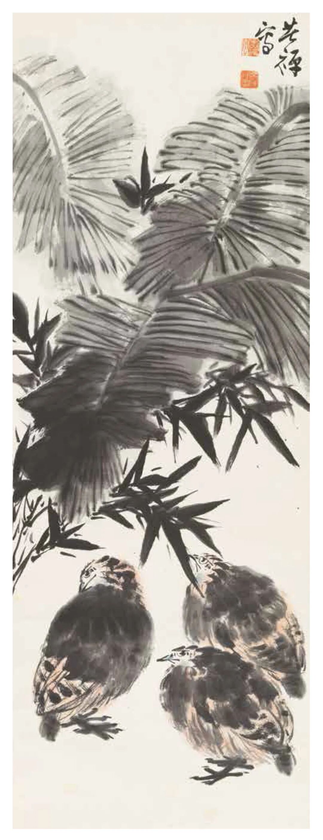 李苦禅 竹鸡 纸本设色 / 94cm×35cm / 1960