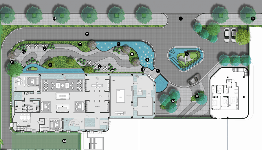 在商业内街与社区外围环道之间,利用水景与绿化分隔,保证生活美学馆庭院空间的私密性的同时最大限度地减小对内街的影响和干扰,营造舒适停留空间。