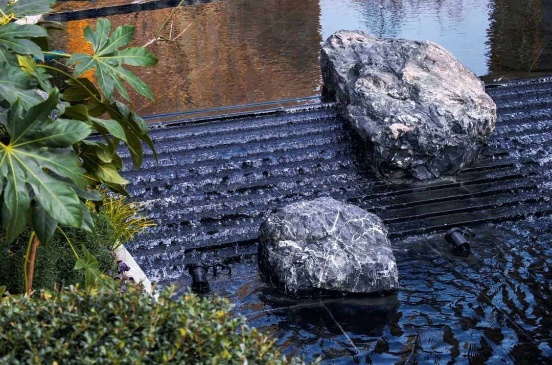 流水相继涌出,跌下石阶或绕过黑山石,潺潺水声叮咚悦耳,水波画出微的曲线波折,久久凝视依然觉得耐人寻味。