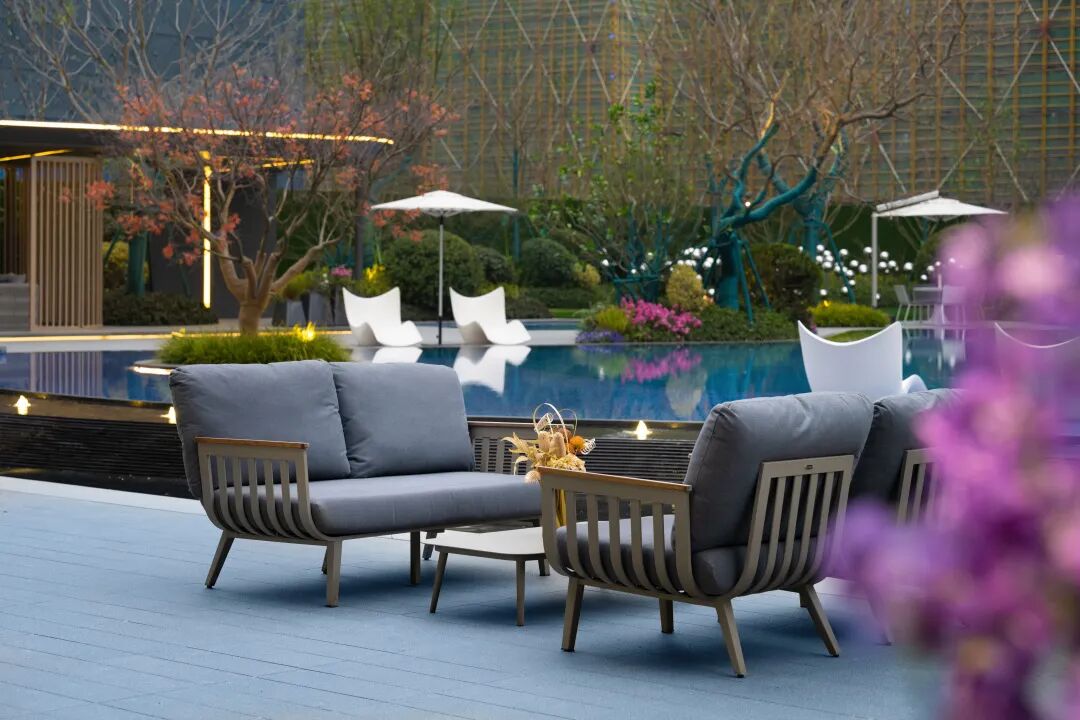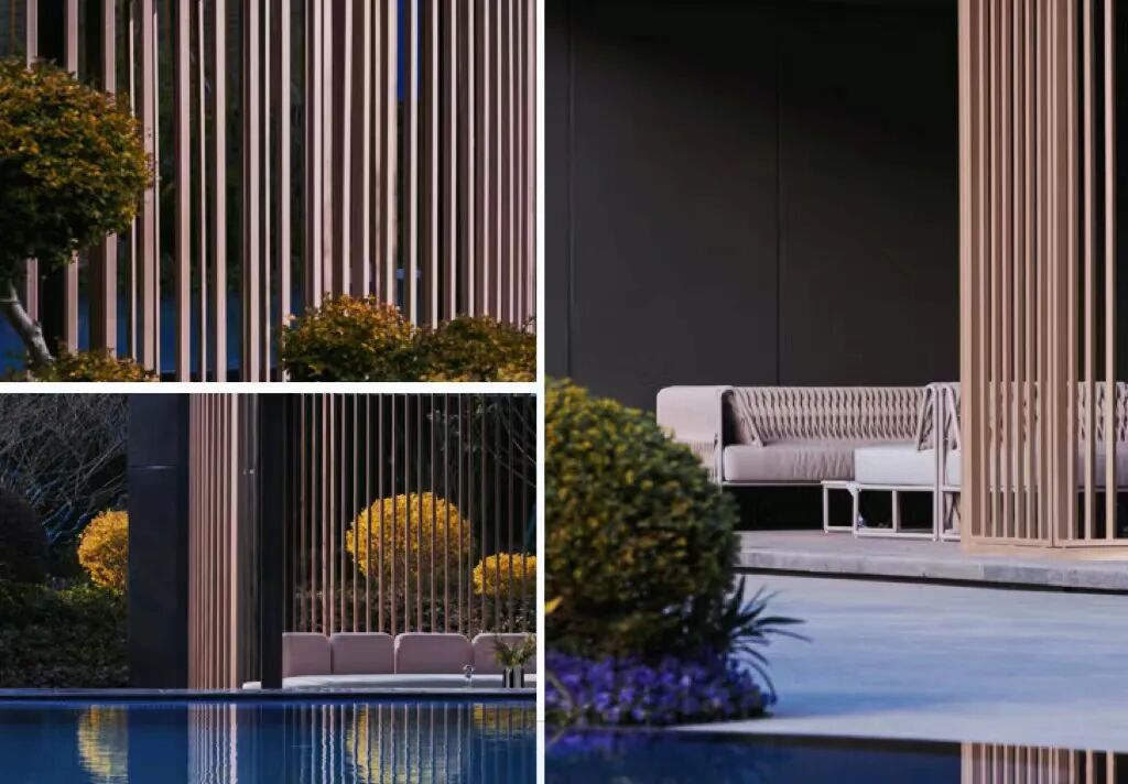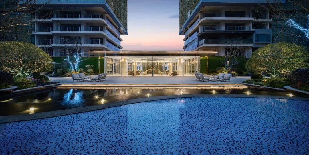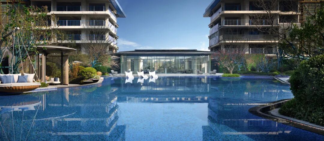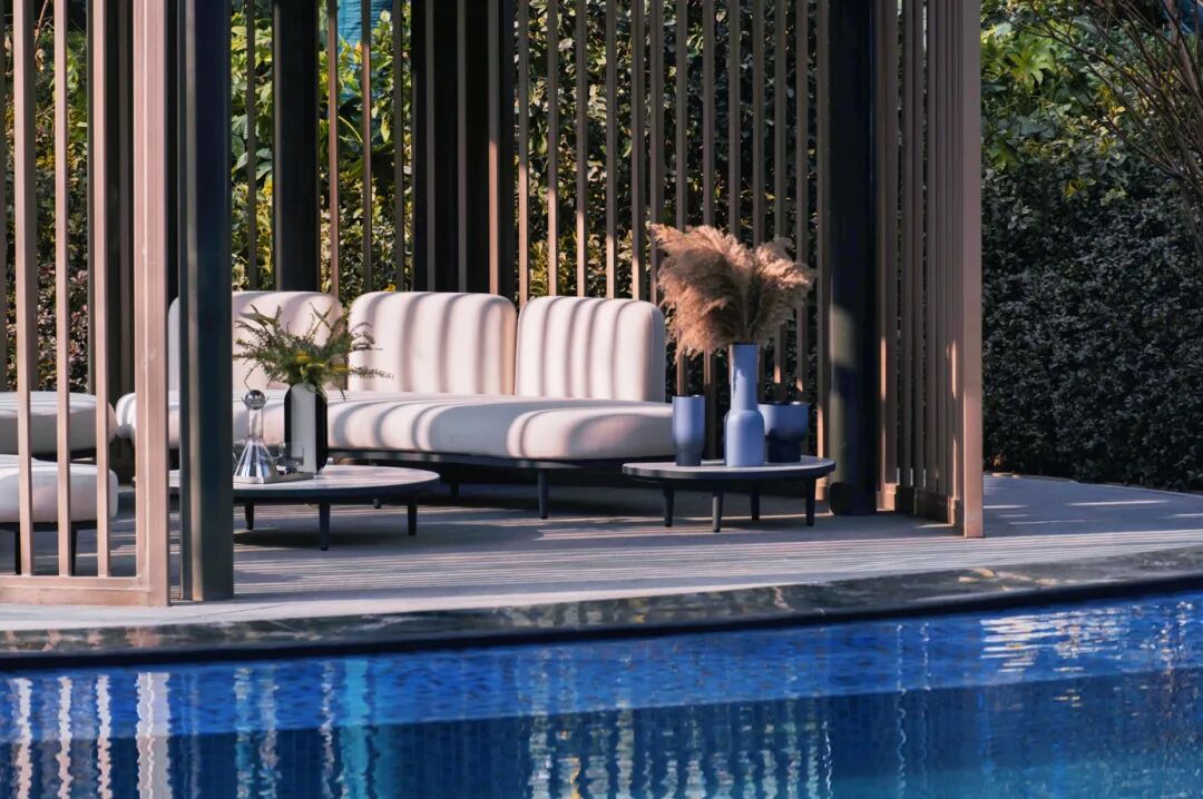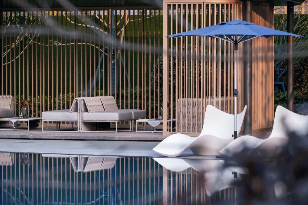 泳池的四周围绕⾼⼤绿植和休憩躺椅,向内围合出一片静谧悠闲的雅座庭院。重重水面倒映建筑、环境与人,令繁杂思绪飘散,自在畅谈,私享此方惬意。仿佛置⾝于独⽴的岛屿。