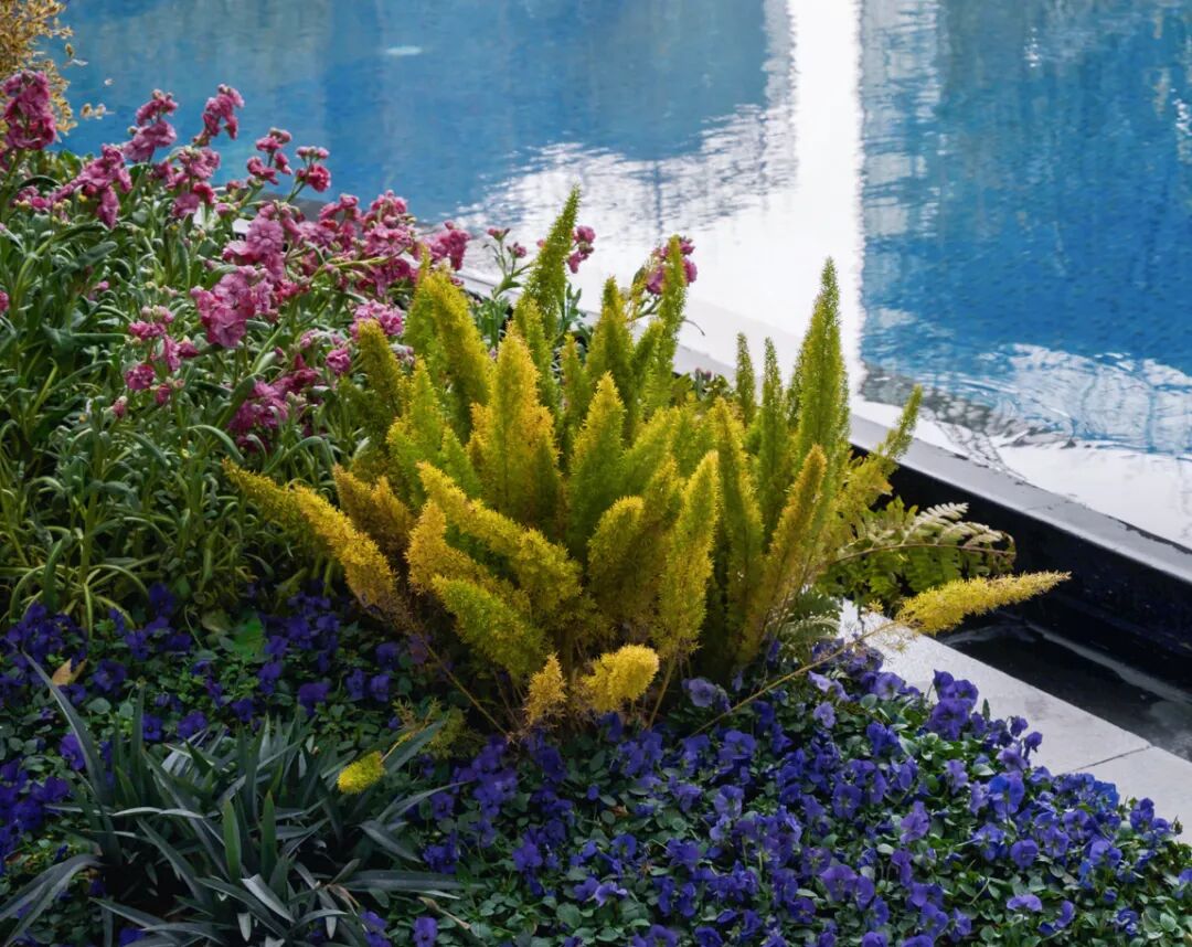 利用不同姿态的植物引导向前,小径的曲折处,低矮的花丛在丰富景观色彩的同时,软化空间线条。葱郁的花境营造出精致一隅,绿叶花簇令心情变得温柔细腻。花香、鸟鸣,听水声潺潺,开始期待春天。