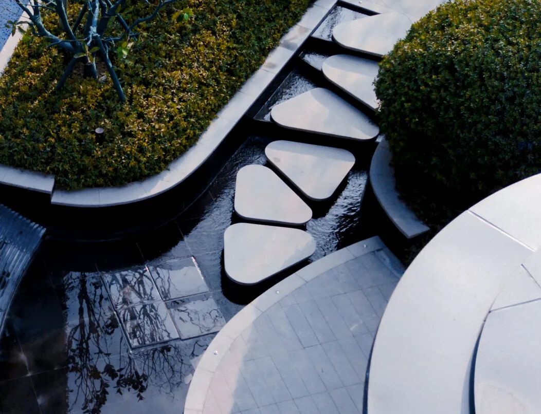 汀步设于水面之上,行踏之间仿佛林间小溪从脚边划过,隔绝尘世喧嚣。